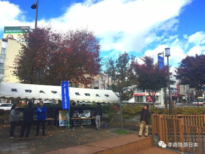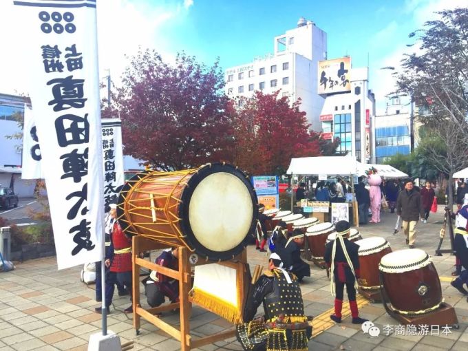 今天从长野市专程赶来就是为了在当年上田城合战的古战场遗址--大手门公园观赏绚丽的红叶。结果刚从上田站出来,就偶遇非常精彩难得的一幕:站前广场上很多日本战国时期武士装扮的群众演员已经在井井有条地做着准备工作,几个大鼓和战旗非常逼真!日本战国时期的那段历史在电视剧,电影和书籍漫画甚至电子游戏中早已广为人知,但是能够实地亲眼目睹现场还原表演气势宏大的古战场,确实是非常巨大的收获。