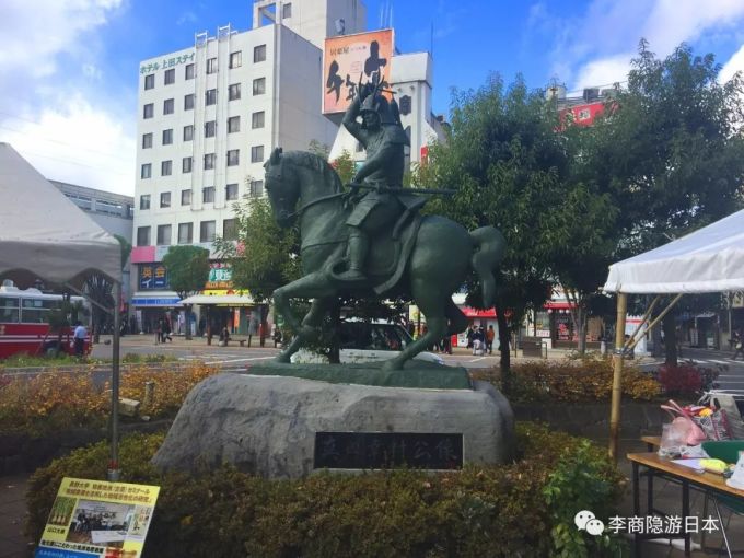 真田幸村策马扬鞭,非常威武,他的骑马像就屹立在上田站前广场,李商隐想起来仙台青叶山顶的伊达政宗骑马像,两人曾是战场上的对手