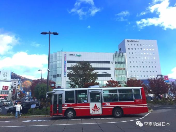 蓝天白云,云淡风轻,红色的上田巴士非常漂亮