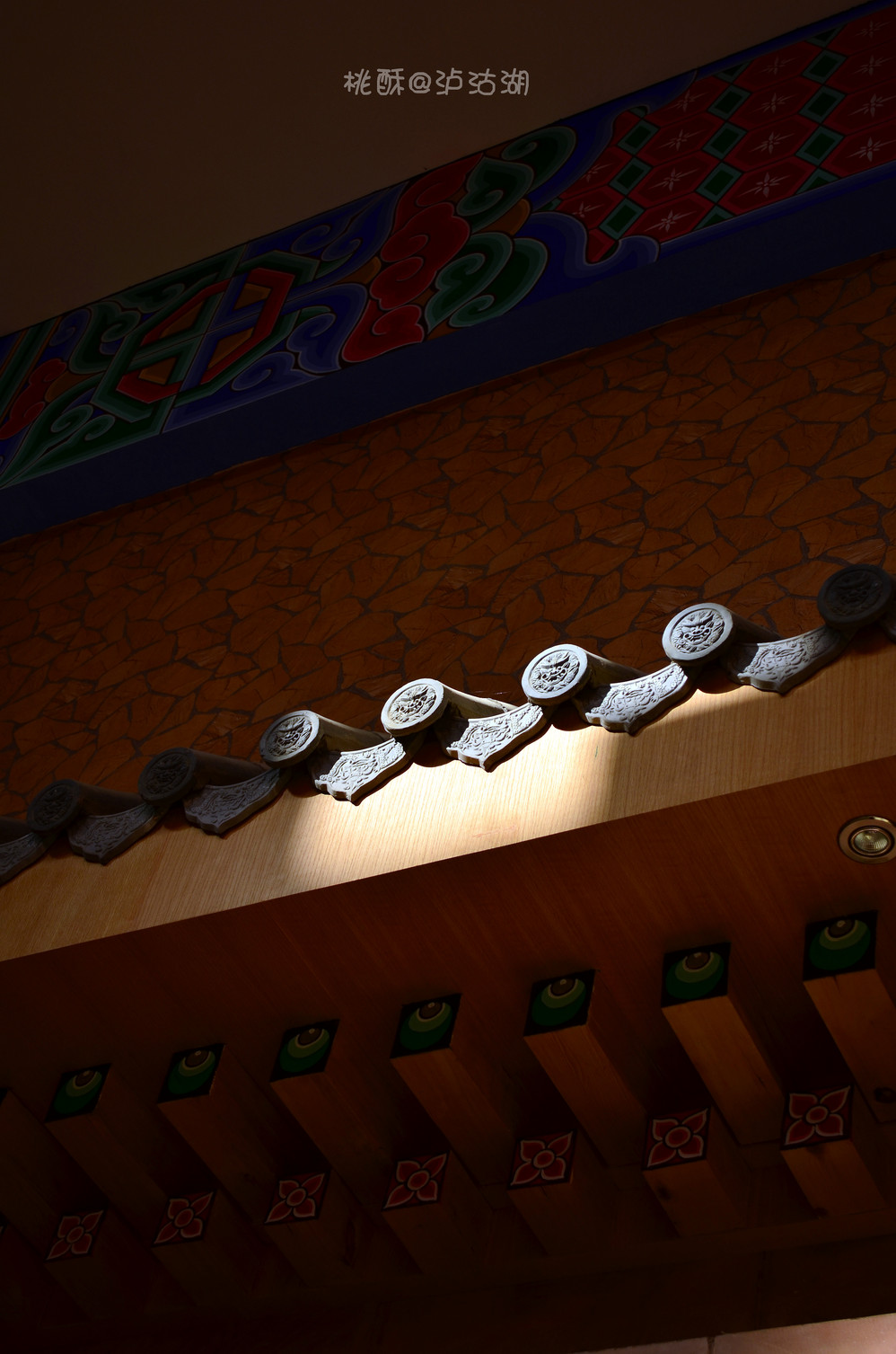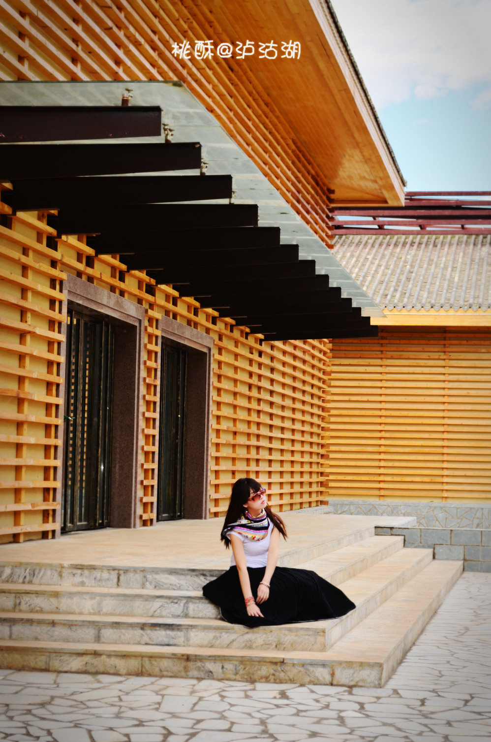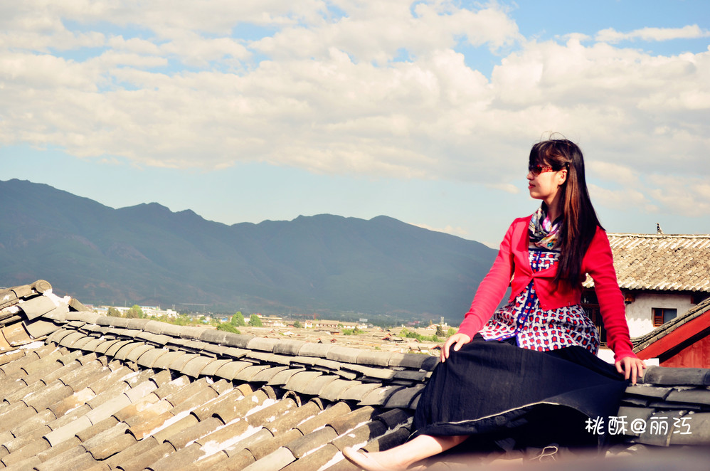 在平台上拉了一位摄影师。我就从平台栏杆跨出去,踩到斜的屋顶上去。凉鞋,也可以叫拖鞋、大长裙子,姑娘我不顾形象,弯着腰,抓着瓦,爬到屋脊就赶紧跨坐上去!这时,身后平台上的人都看到了我,有喊“真猛!小心走光!”,也有喊“小心把屋顶踩塌!”,还有喊“屋顶上有个美女!”,哈哈,我喜欢最后一句。