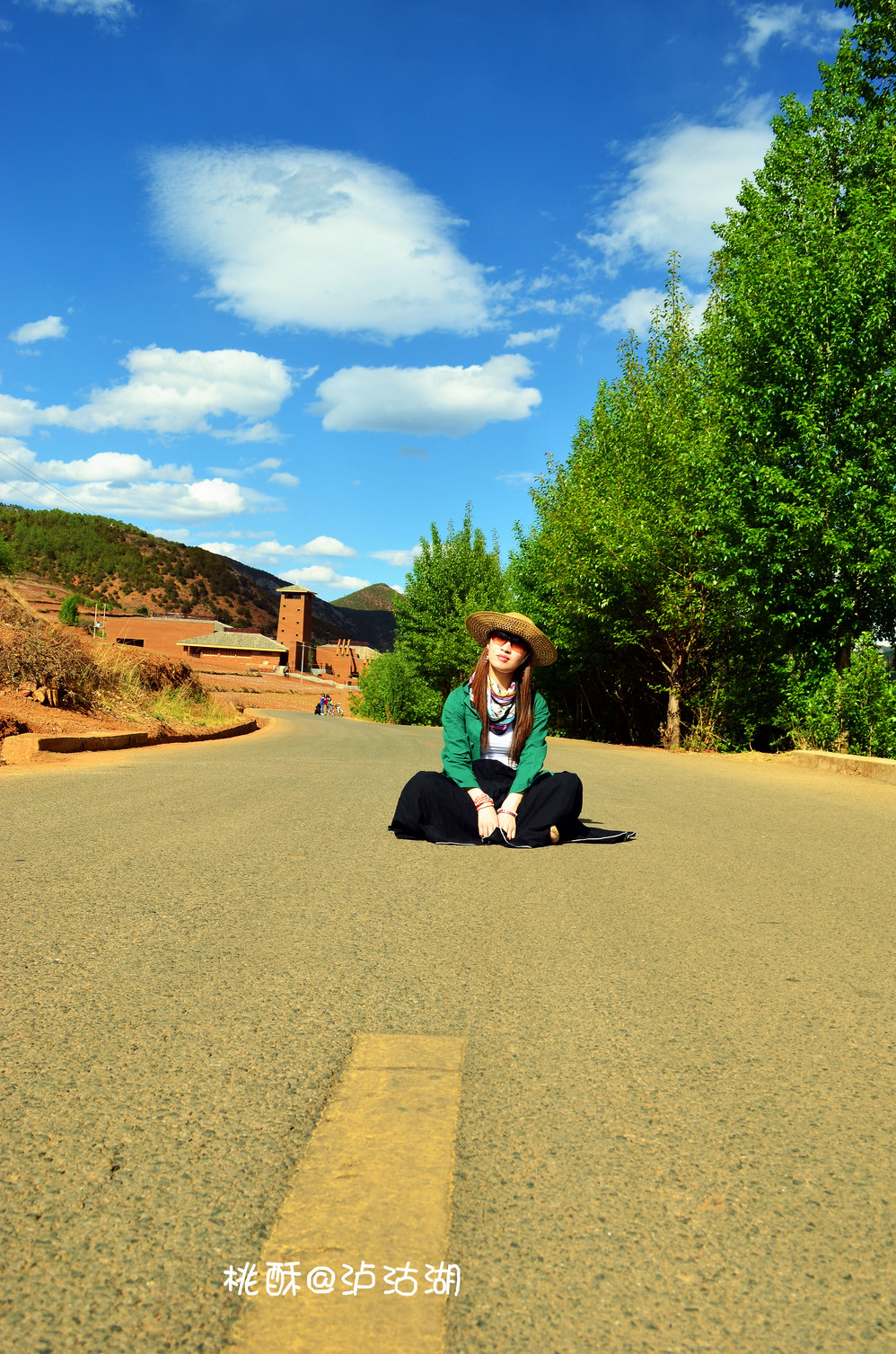 新通车的环湖公路。介是俺的自拍照。远处高的建筑是摩梭博物馆的炮楼。