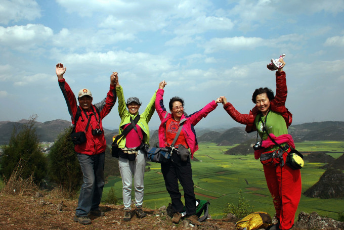 姐姐妹妹嗨起来!登上金鸡峰,面对眼前的美景,情不自禁的雀跃哦。