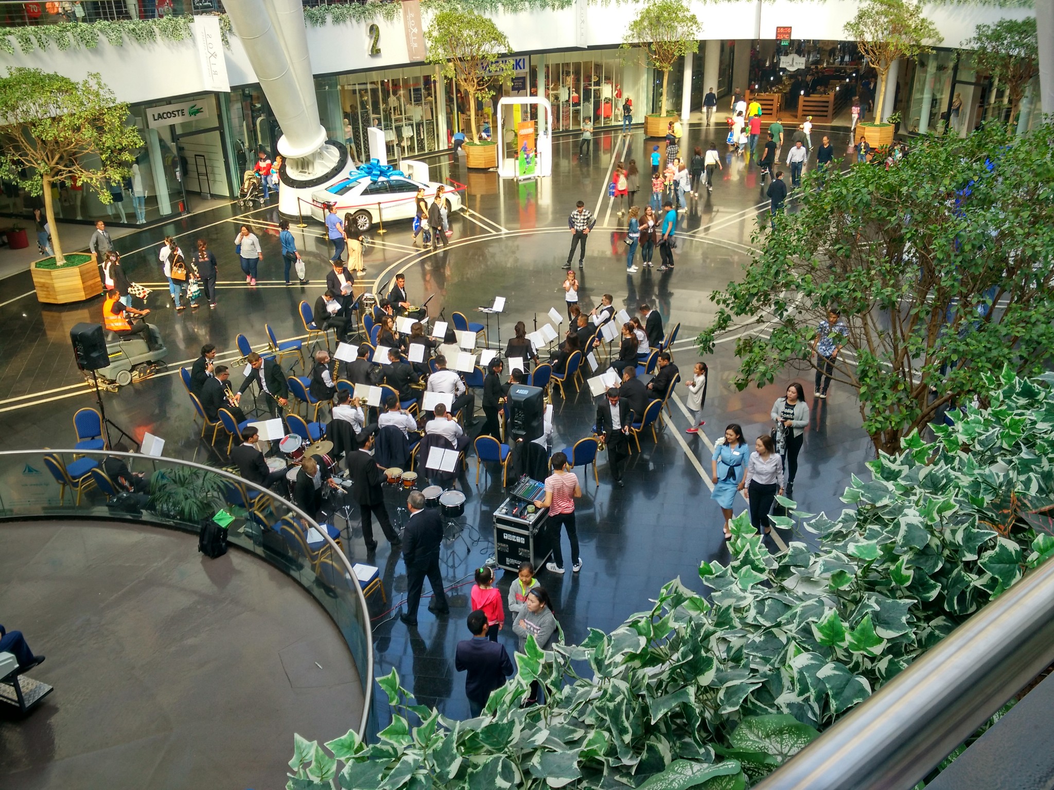 走进帐篷发现面积其实不算大,和国内近几年新开的购物中心相比也没有什么惊艳之处。但是帐篷中心有个跳楼机,中庭有个管乐团在演奏,整个商场洋溢着一种说不出的欢乐气氛。