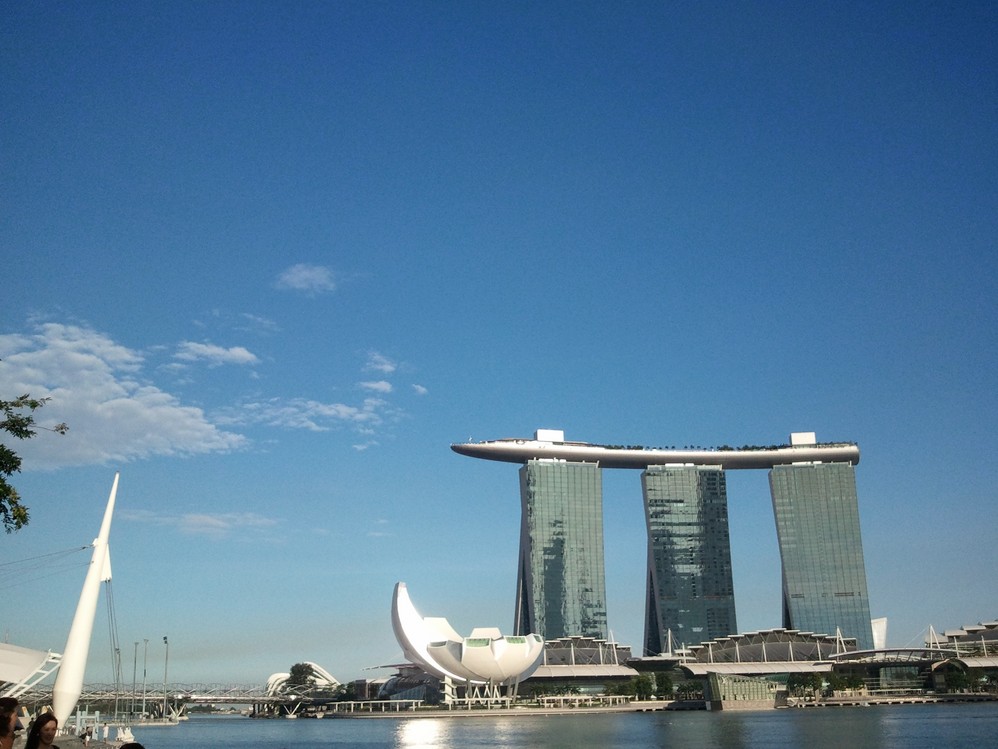 在獅身魚雕像的對岸,便是新加坡著名的酒店-有著空中游泳池的金沙酒店(/poi/22114.html),食宿加賭場一體。問了下新加坡的朋友,其實這個建築建成這樣是有原因的。新加坡人也比較相信風水,所以並立的三座建築,代表了三炷香;但是在他們的中間又被橫攔了一刀,這是為什麼呢?原來,是由於這裡有賭場的緣故,所以風水師傅們要用這刀把財都截下來,以免外流。哈哈,很有趣吧。