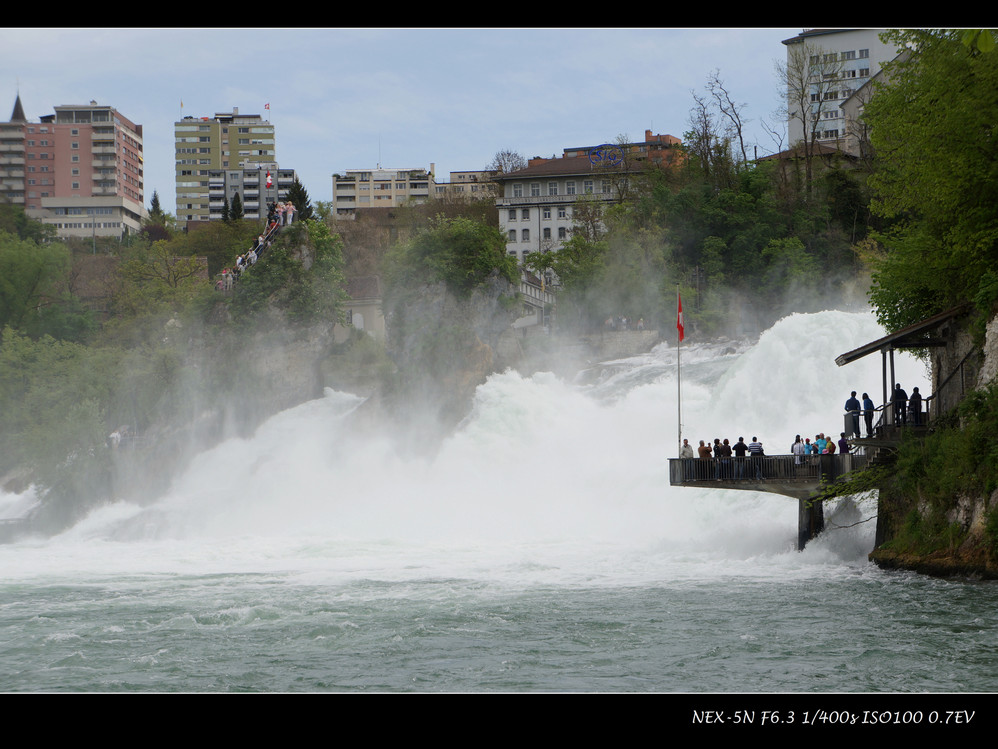 莱茵瀑布其实落差只有23米,说他是瀑布的话还真有点怪,她的构成就是天然河道的落差形成的,跟世界上其他的著名瀑布肯定是不能比的啦,但水量是真心大,无愧于竟是欧洲 最大,我们也算见识过了。进入景区是要门票的,价格是8CHF(近55RMB了),就是下图中那些人站的位置,我们没去那里,从检票口另一个岔路往下走,正好能看到这个瀑布,也不用门票,所以就不花这冤枉钱啦,哈哈