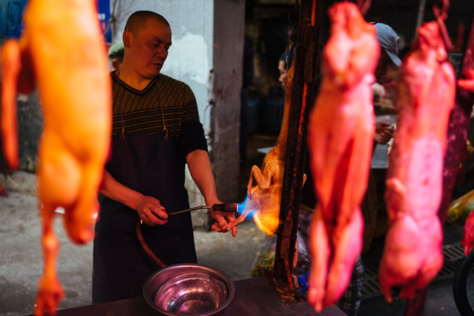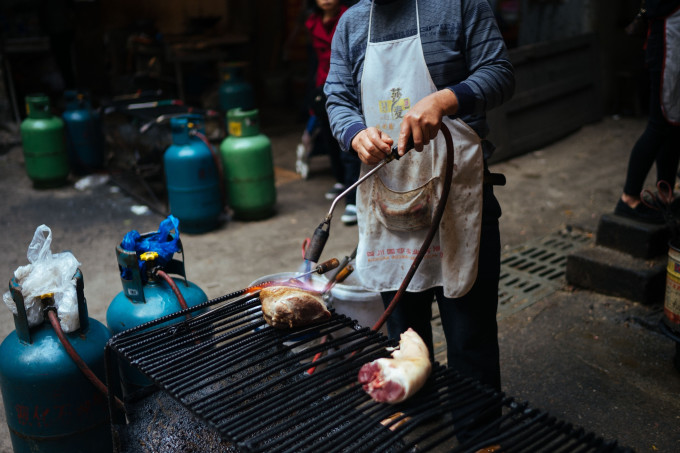 大叔很得意的开始烧鸡毛,特意把我叫过去让我拍两张