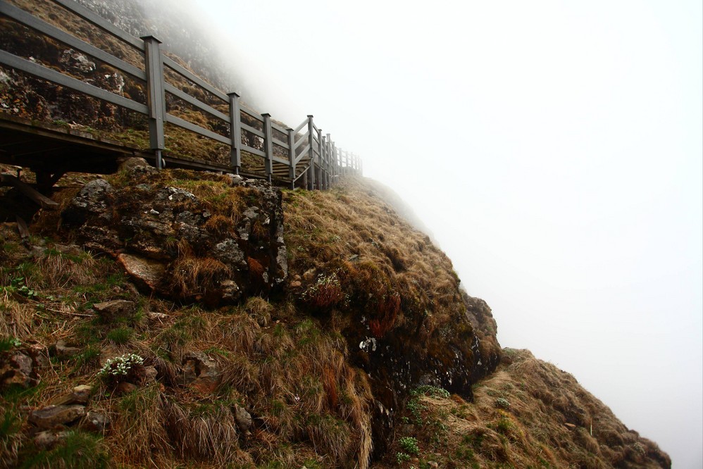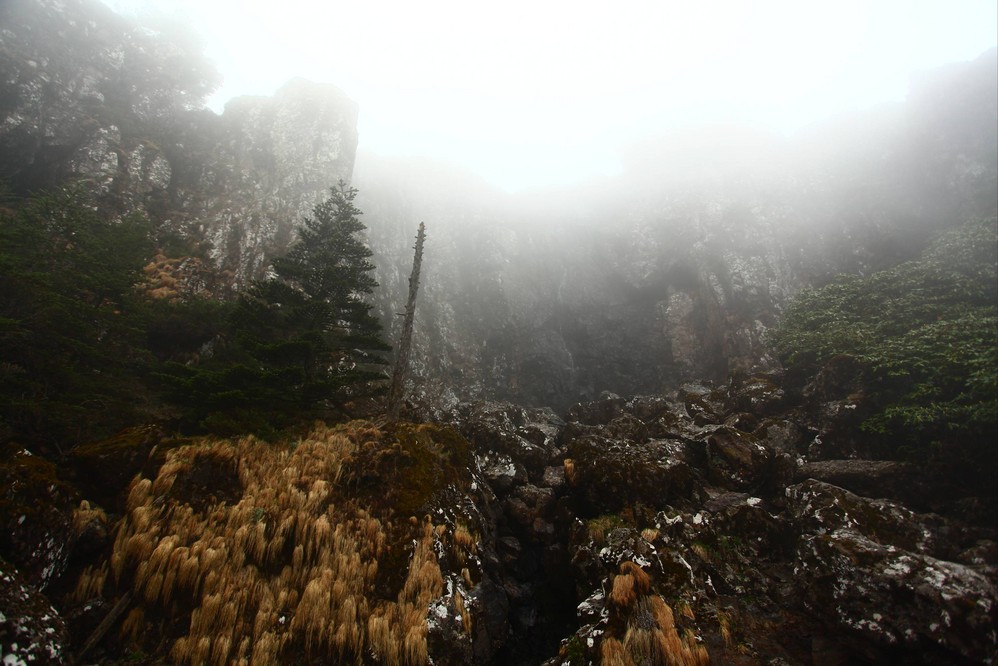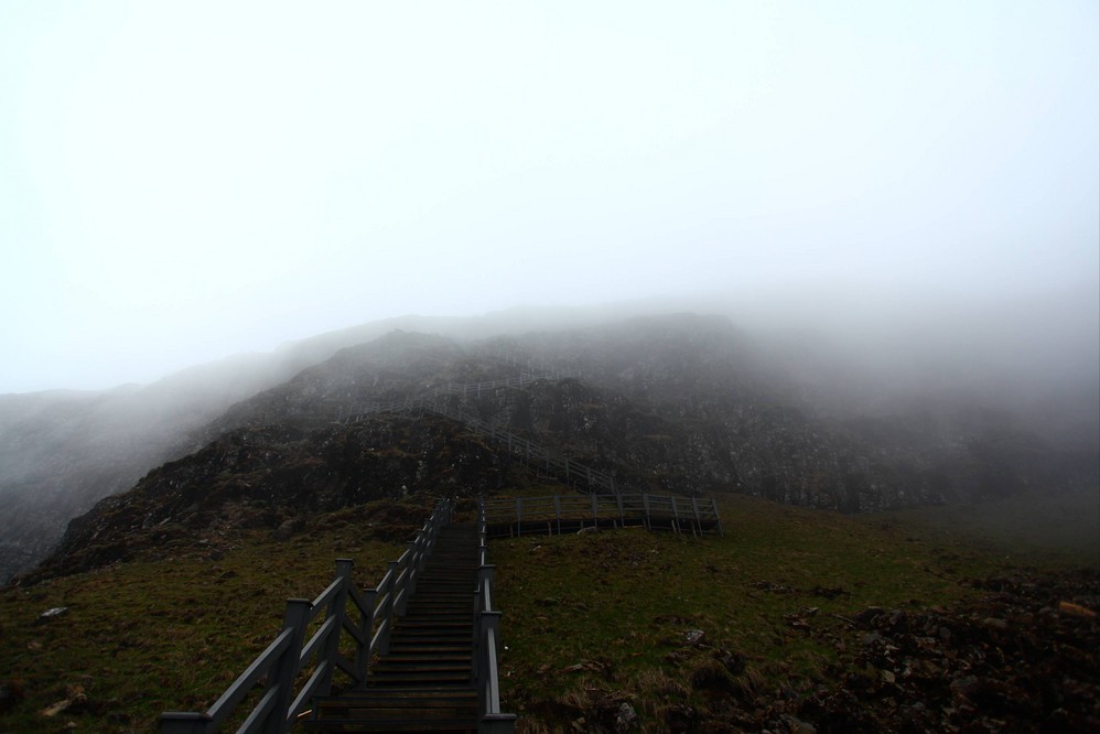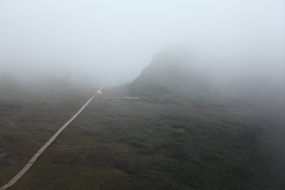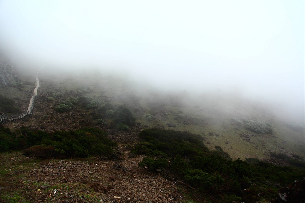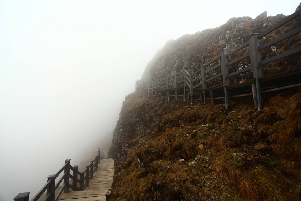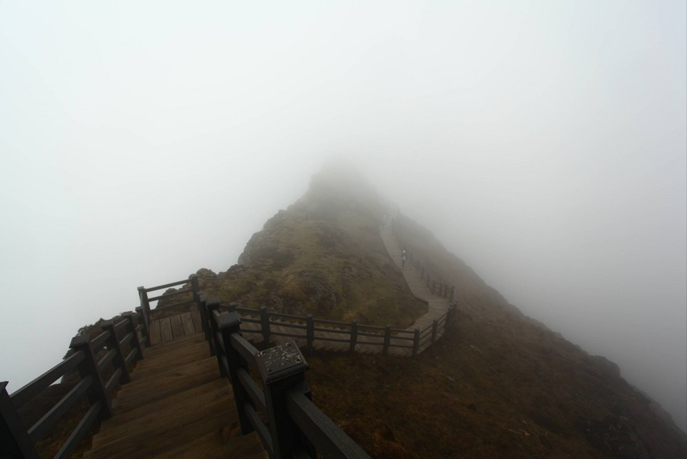 到顶峰后开始下山没想到的是雾越来越大,而且开始下雨。