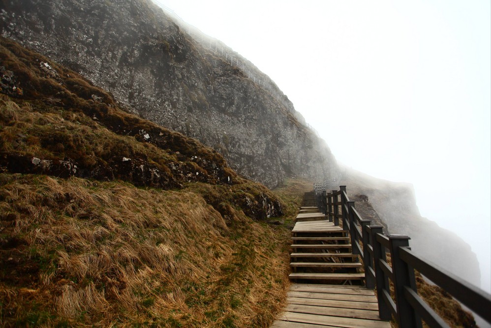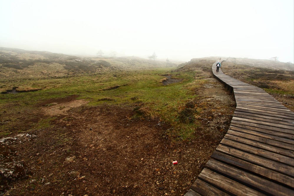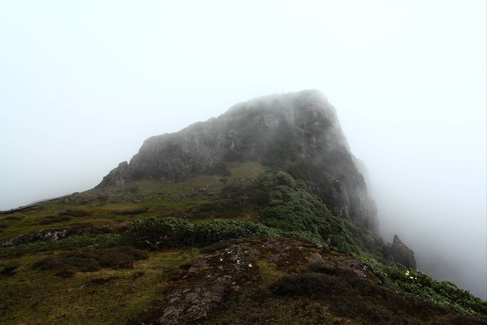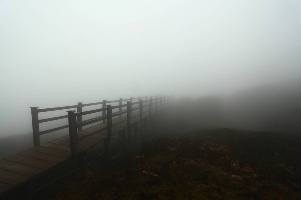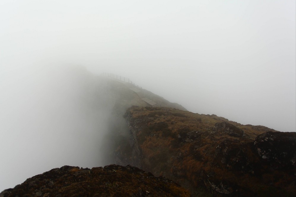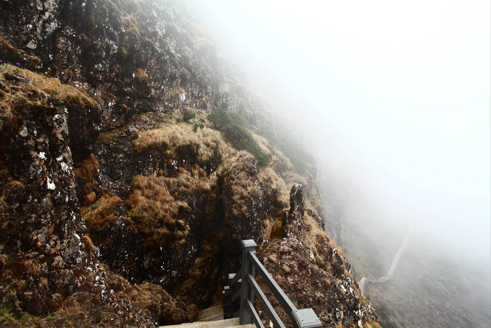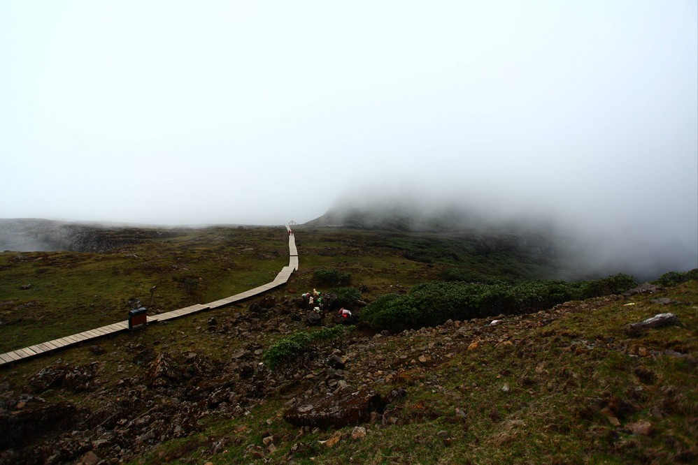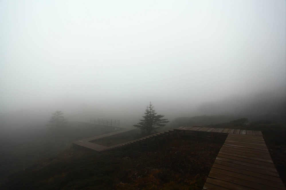 到顶峰后开始下山没想到的是雾越来越大,而且开始下雨。