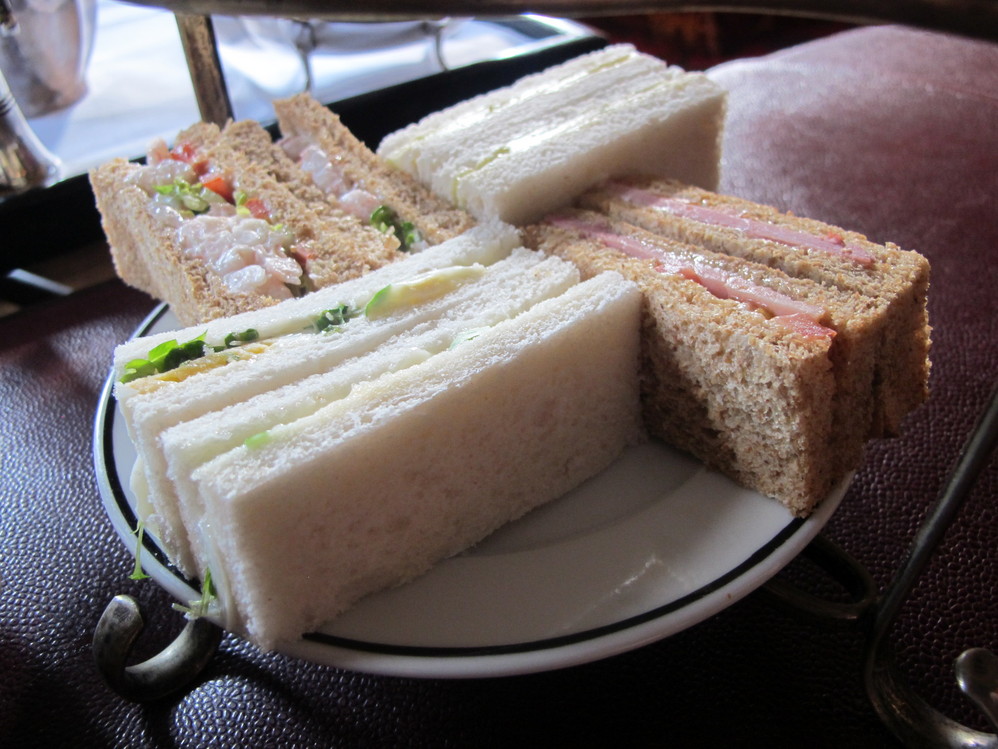首先是: Finger Sandwich,裏面包含了: Honey roast Ayrshire ham,Dijon Mustard butter on brown bread Prawn; Lettuce and tomato,lemon mayonnaise on brown bread;Egg mayonnaise and cress on white bread;Cucumber with dill butter on white bread.