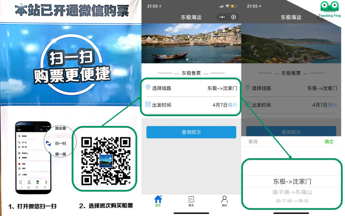 (1)线上购票、线下取票:微信小程序搜索“东极海运”(或扫描以下二维码),共有三条航线供选择,购买成功后前往出发码头兑换纸质票。