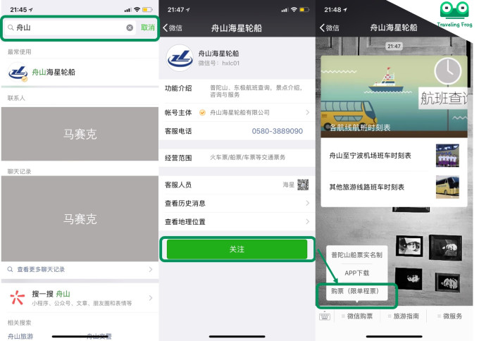 (1)线上购票、线下取票:微信公众号搜索“舟山海星船舶”,凭身份证号提前2至3天进行购买,票上有指定座位号。网上预订并付款成功后,于出发前当天前往沈家门港半升洞码头售票处兑换纸质票。