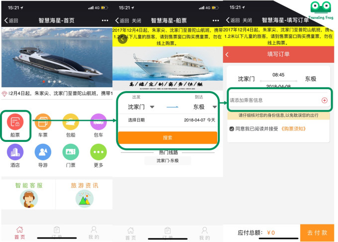 (1)去程:由于每日从沈家门前往东极岛船票有限,为了保证买到船票,建议通过网上购买、线下取票的形式购票。
