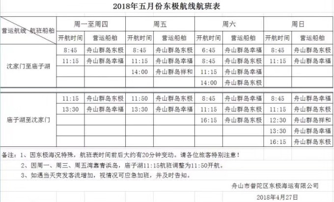 无特殊情况下,工作日航班较为固定,节假日航班会有所增加,具体时间表均可通过各出发码头售票处查看或新浪微博关注“舟山东极岛旅游”。