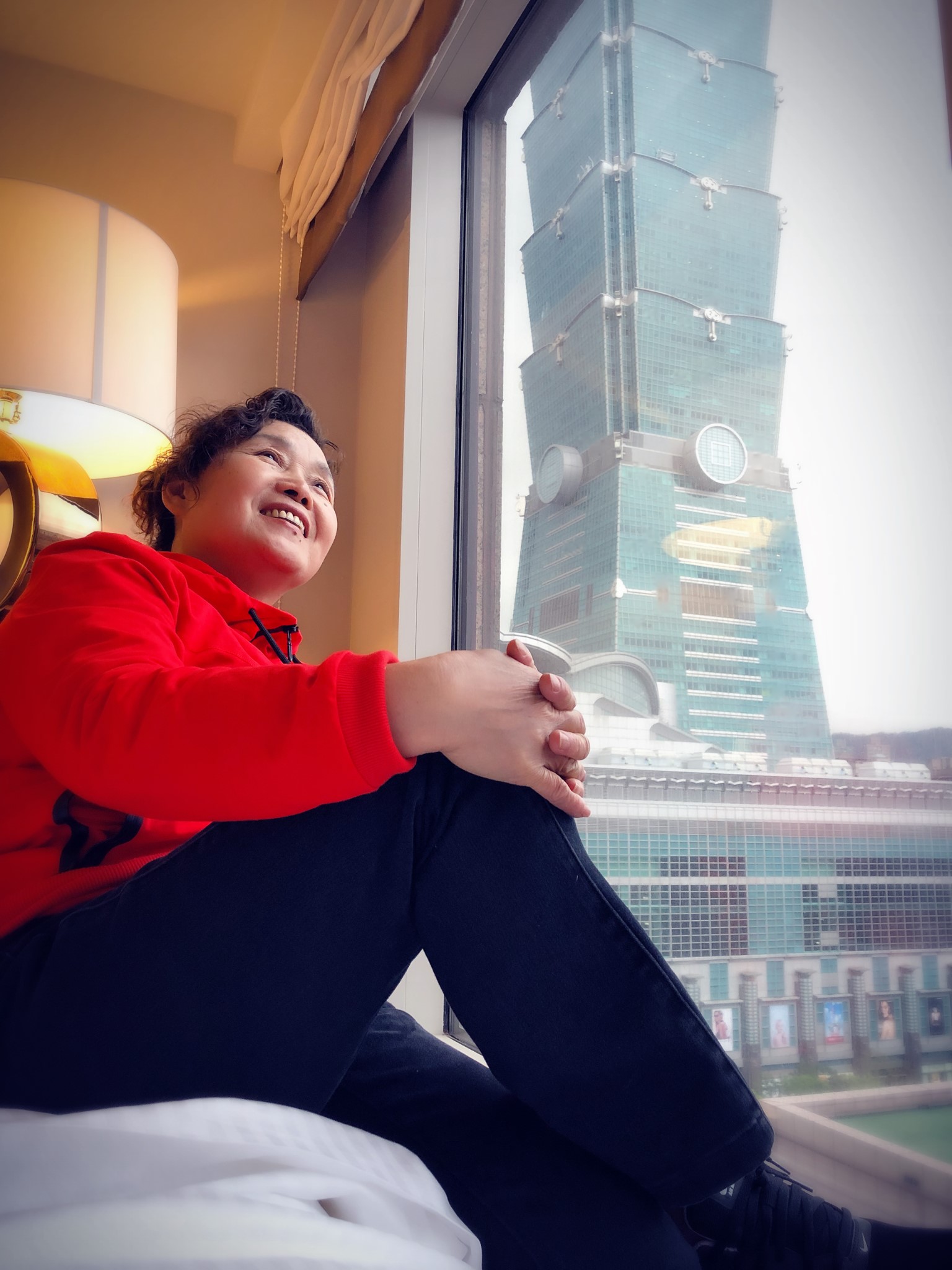由于刘姐的工作关系,我们一如既往入住hyatt。台北的君悦酒店位置超级了,就在台北101旁边,从酒店边门可以直接走天桥进入101大楼的2楼商场,简直风雨无阻啊。更爽的是,这次前台一个日本小姑娘,给我们安排的房间窗户正对着101,足不出户就能感受101夜景,让我们对这个城市又加分不少。开心的刘姐在房间里又开始凹了!