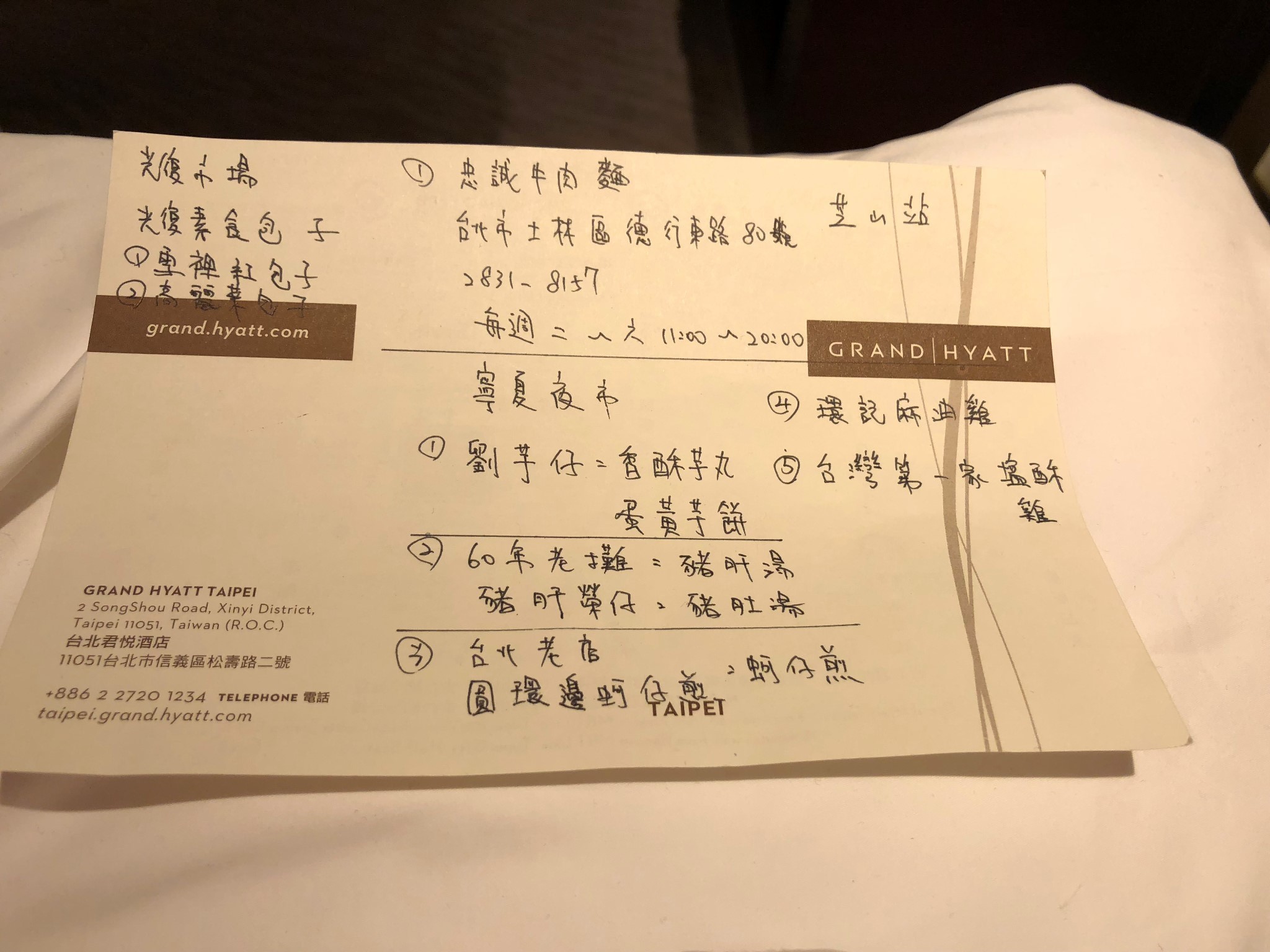 到酒店后,惊喜的一幕发生了!见图!小伙子给了我一份明日推荐美食。而且我把原来的计划告诉他后,他还帮我规划了具体路线让我更顺利的能吃到这些。哈哈哈,难道吃货是脸上有标记吗?他怎么这么了解我呢?