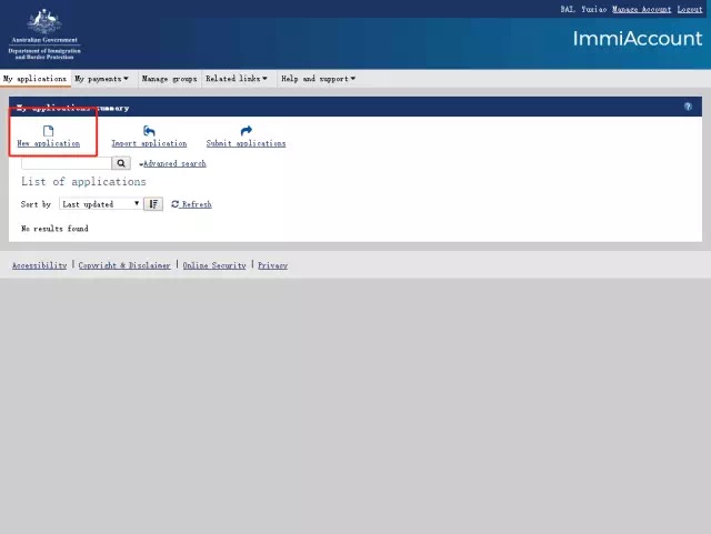 完成注册账号后,点击New application开始申请签证。