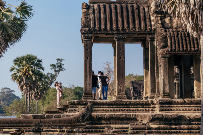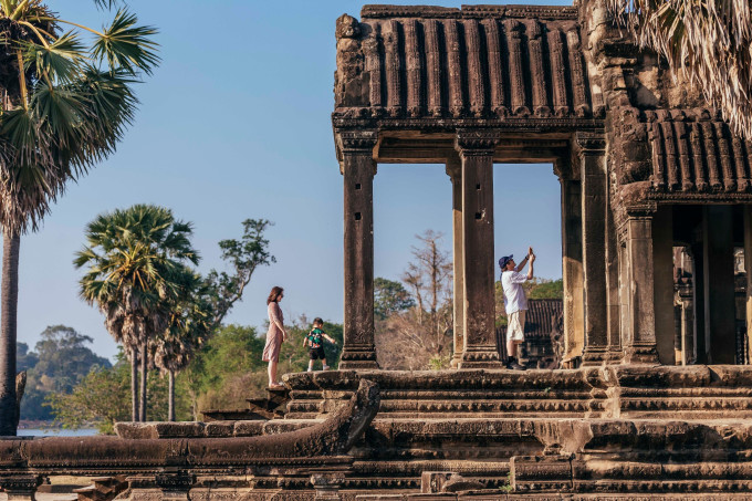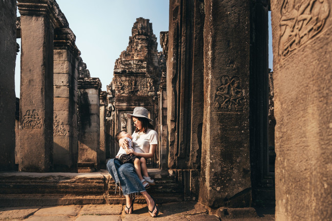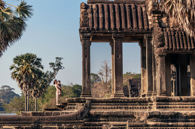 旺季的吴哥大门前,空荡荡的走廊,你抱着娃,静候廊中的风。