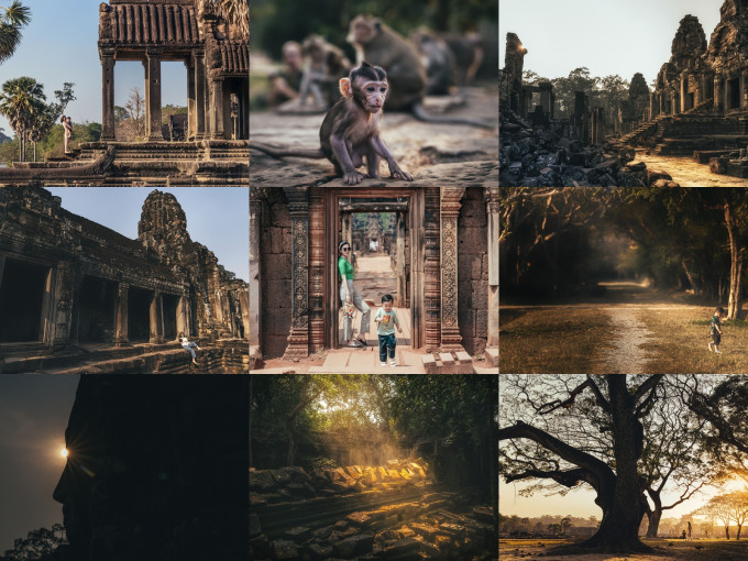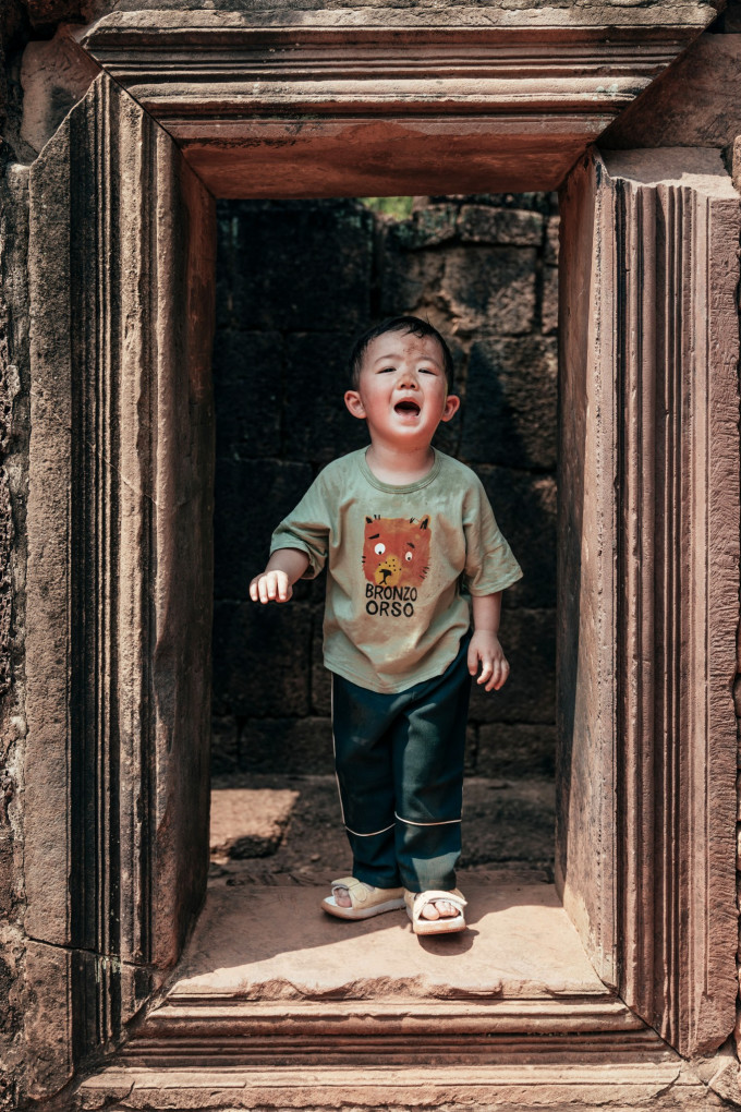 包场吴哥,感觉我在做梦?络绎不绝的游客穿梭其中,如果你选择等,或许能守到空窗。可是2岁的娃不会陪你执手立黄昏,他对这个楼梯的爱只有3秒。怎么办?基本保持相机机位不变,多拍几张,然后PS用下面两张图溶图合成,这样会省去了大量后期时间。