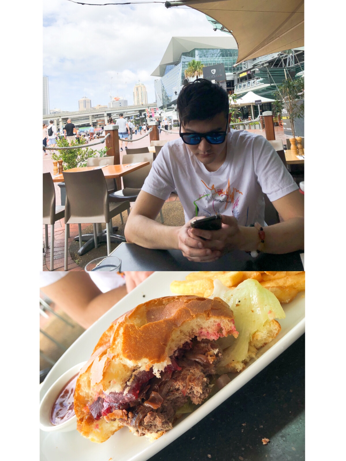 下图是我们的午餐,在达令港岸边一整排餐厅,随便选了家吃了个袋鼠肉汉堡…… 真的不好吃