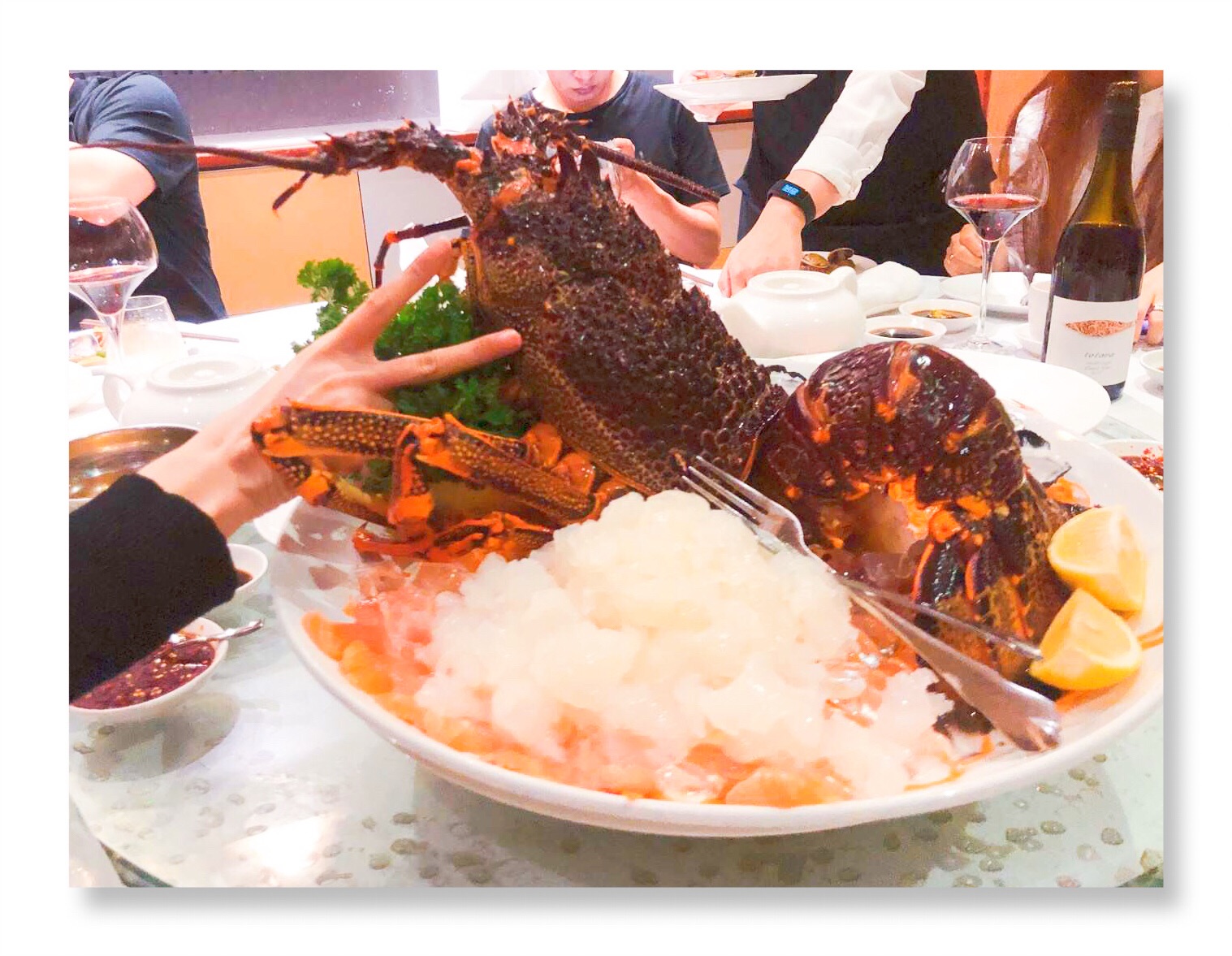 晚餐是朋友招待了一顿澳龙…再次感叹下高物价,一顿饭小1w 人民币… 这只澳龙3斤多 大概6k人民币左右………店在唐人街 很多人等位