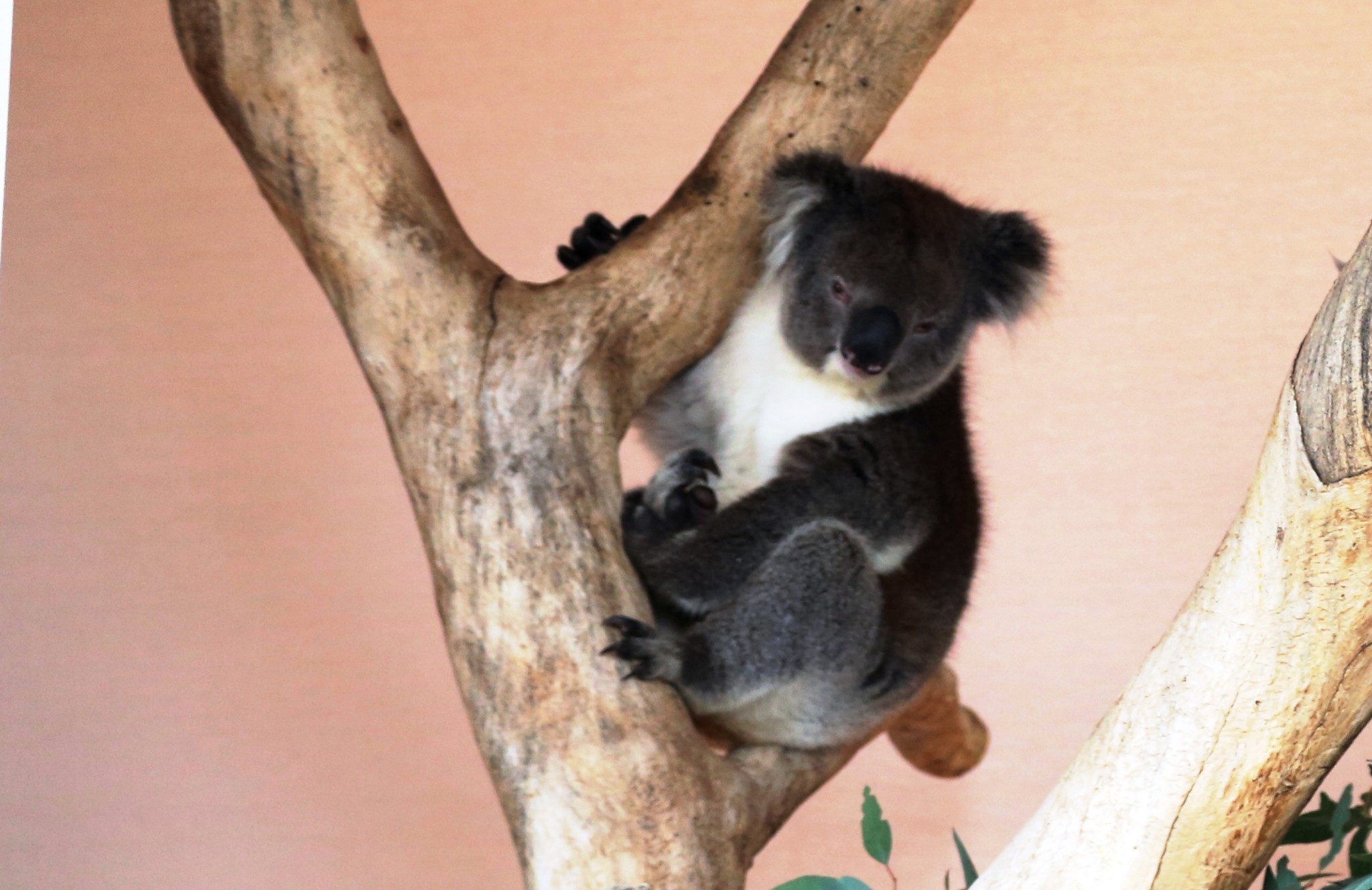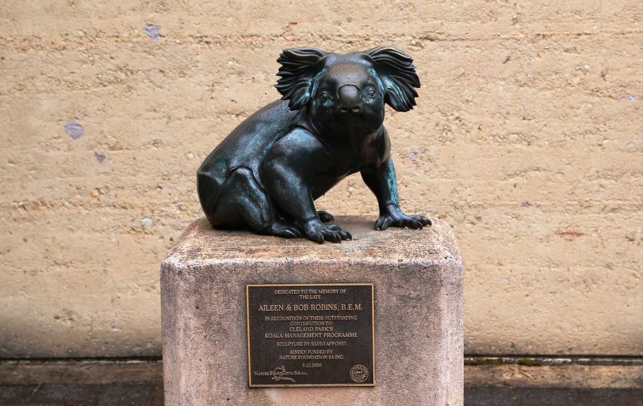 墙壁前的铜考拉像,耳朵毛发张开,眼睛炯炯有神,好像在欢迎每一位游客。