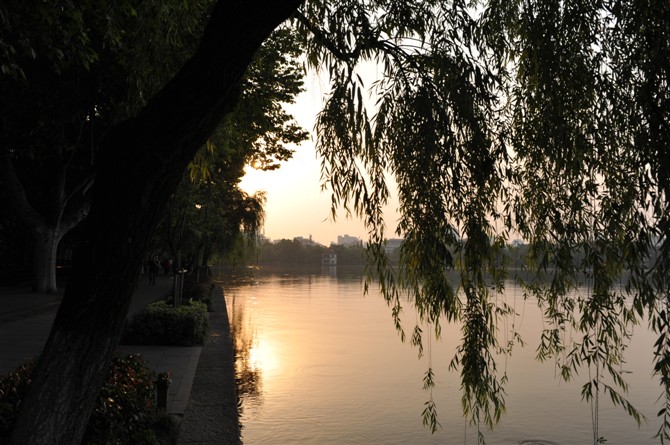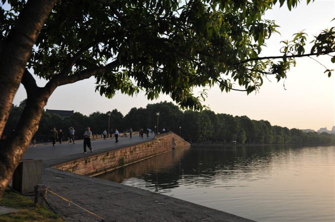 我的耳边也不断响起徐小凤的《南屏 晚钟》,低沉而温馨的歌声-------“南屏 晚钟,随风飘荡,它总是飘啊,飘在我心坎上------”一曲歌,能唱活一段封存的历史,这就是音乐的力量。我此时此地,徜徉在有历史的记载的河堤旁,看晚霞已经没有可能了,当天的黄昏没有很好的余晖。听钟声,也只能明日请早哦,(至少是当天,)就领略、体验一下夜晚的韵味-------。