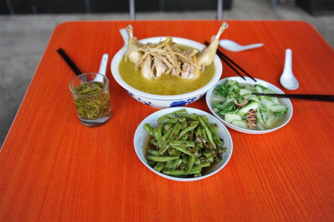 二素一荤,全鸡加上干竹笋用高压锅烹饪,顷刻间绿油油,杭白菜、四季度和金灿灿的全鸡鸡汤,悉数登场,看到我更是饥肠辘辘,我用数码机记录这瞬间。