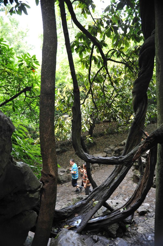 远处有人走过来,很小很小,就是远呗,又有一个橘红的颜色,万绿中的橘红色,是很好的点缀色,我占领有利的角度,以苍劲高大树 为主题,陪衬曲曲弯弯的小路,远处有白色和橘红蠕动的人,一定是要很“渺小”人,这样才能显示树的高度,如此强化的对比,会是照片更有想象的空间。