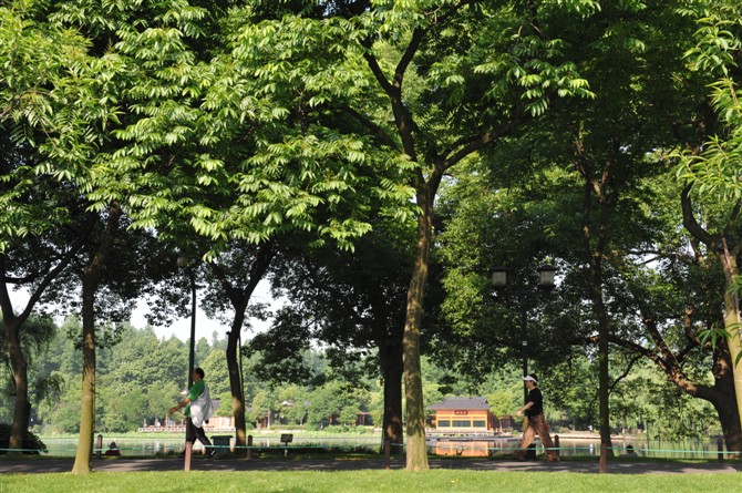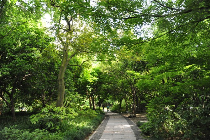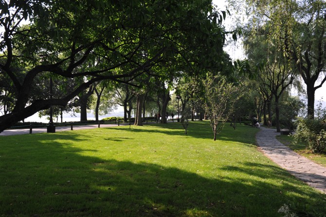 长长的苏堤很是养眼,堤的二旁,绿地成荫,高高的大树 ,是天然的庇荫所,偶尔穿透的阳光,时而呈斑斑状,时而呈不规则点状,若隐若现,煞是好看,看看绿茸茸的绿草坪像地毯一般。这不由使我想起俄罗斯 画家古因兹的《小白桦林》和列宾的油画,大有异曲同工之妙用,特别是光的暗部色彩异常丰富,看了很有感觉。苏堤经过这么多年的呵护,自然绝妙了。我决不吝啬数码机的快门,拍摄一定数量照片,这也许就是旅游带来的快感哦。