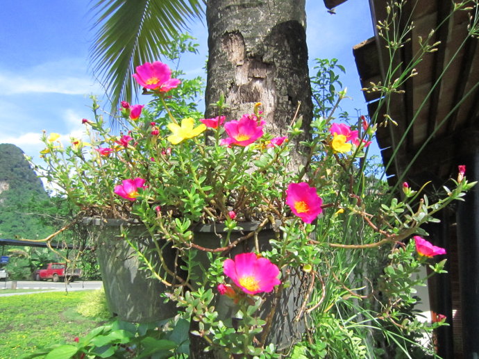 树上绑着盆,盆里栽着花,平实朴素,夏意盎然。小时候,我们管这花叫蚂蚱花,颜色鲜艳,撒籽就活
