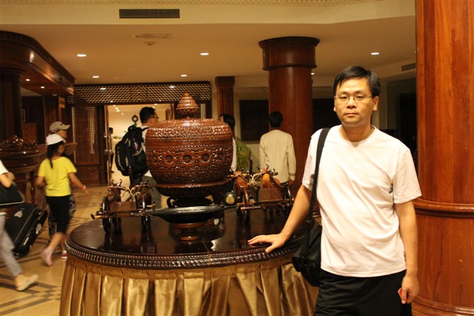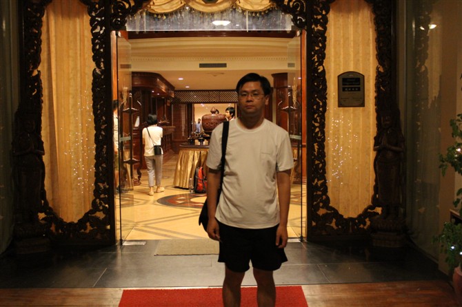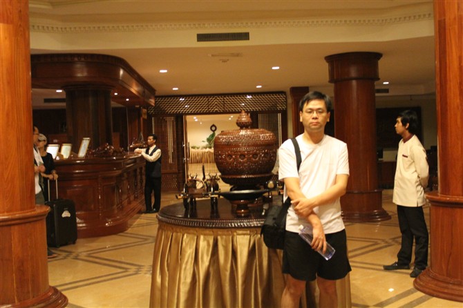 阿忠说晚饭会在金边 的一个中国 人开的五星级酒店吃,弄得心里痒痒的,去了发现原来是吃自助餐,每人8美元。由于金边 的导游顺利找到,所以阿忠在吃完饭后就悄悄离开了,老婆和我都感到有些依依不舍,阿忠幽默、风趣的介绍,对柬埔寨 风土人情不厌其烦的讲解,以及流利且有点奇怪的发音都给我们留下了深刻的印象。金边 的导游也是个华裔,20多岁,是第三代移民,不同的是他的父母都是中国 人,对他的感觉实在有些模糊,姓什么也记不清了。