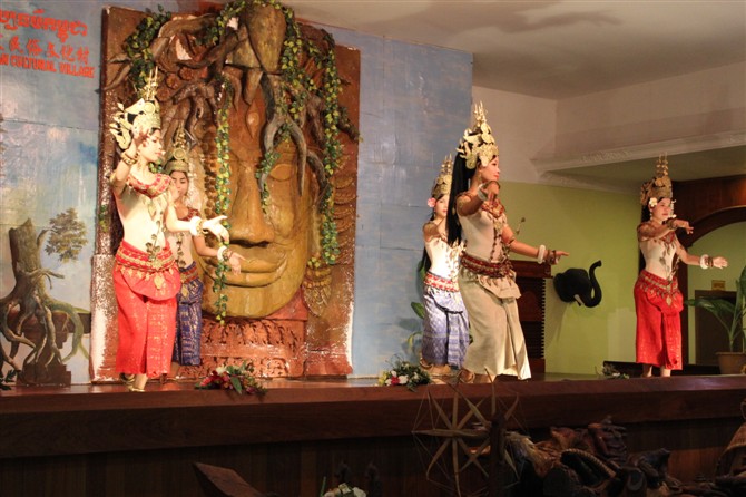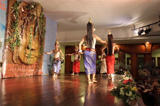 从暹粒 机场出来的时候已经是当地时间晚上八点多了,当大巴开出十几分钟后,对暹粒 有了一点初步的印象。第一,暹粒 比较小,大巴几乎一直在笔直的前行,看不到有什么交叉的街道;第二,路边林林总总的酒店(包括很多在建的)告诉我们这是个新兴 旅游城市;第三,没想到路边有那么多的中文广告牌,让初到异国的我们有种非常亲切的感觉。