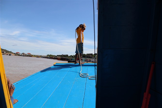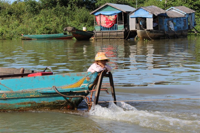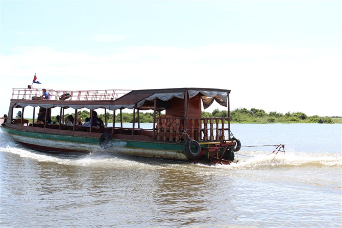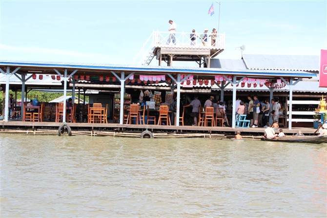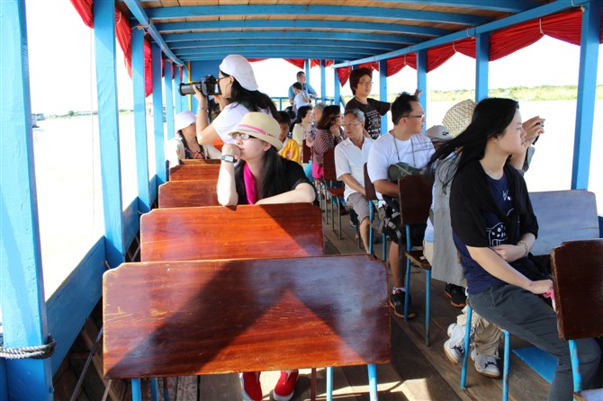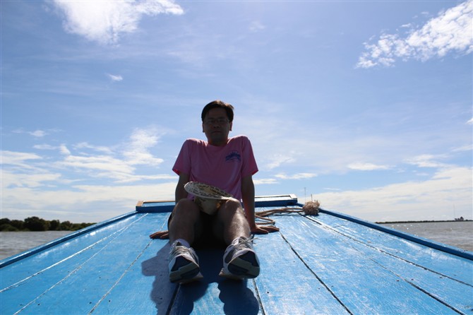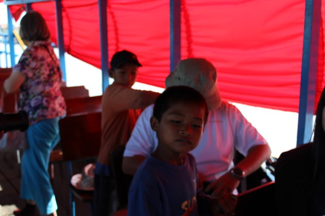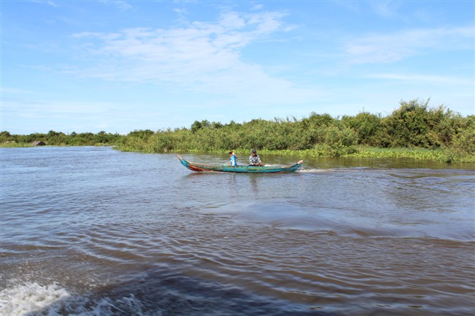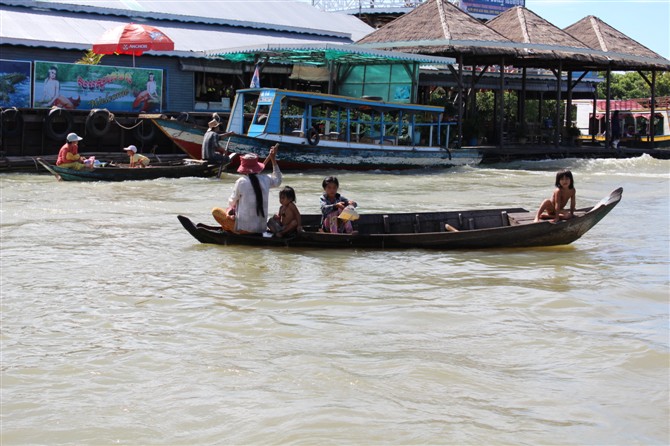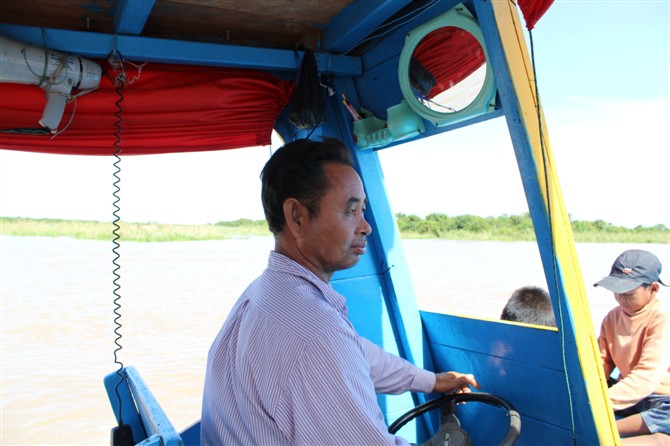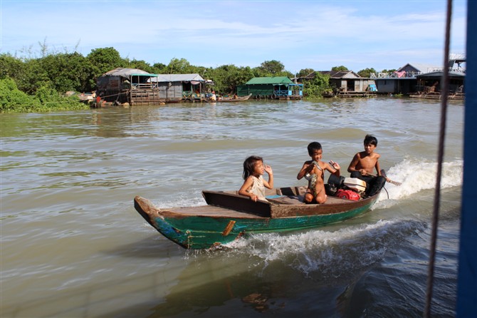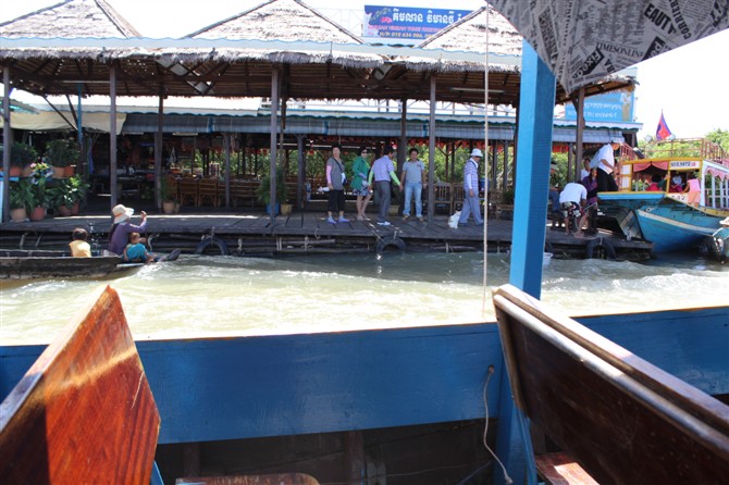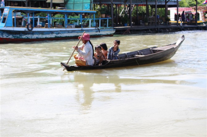 看到了一条小船,热情的给他们打招呼,没想到他们比我们还热情,开着马达就冲过来了,原来是乞讨的,手里拿着一条大蛇吓唬我们这些游人,不给钱就不走,只得给了他们1000瑞尔了事。