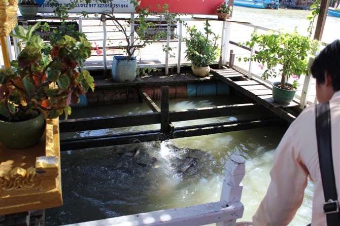 还有养鱼的,游人们可以用大虾来喂鱼。