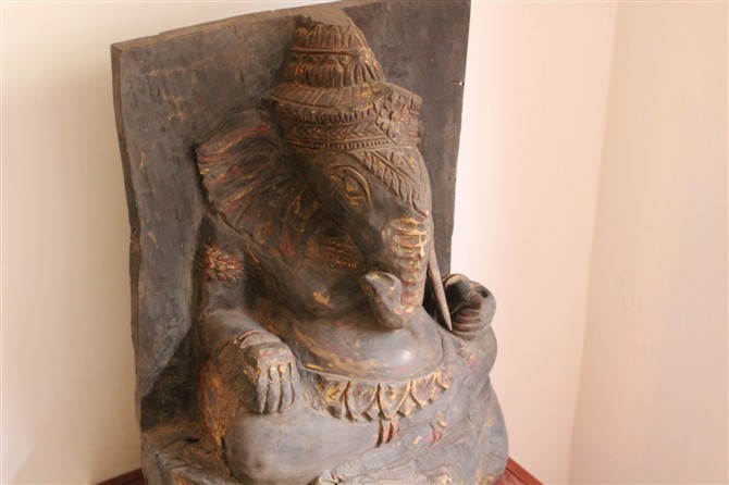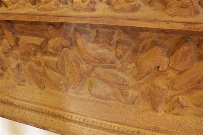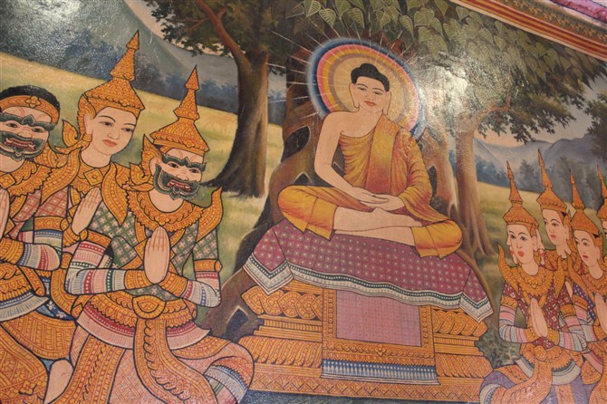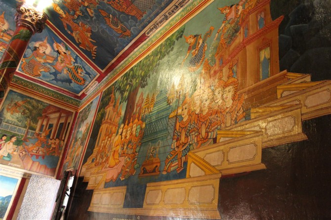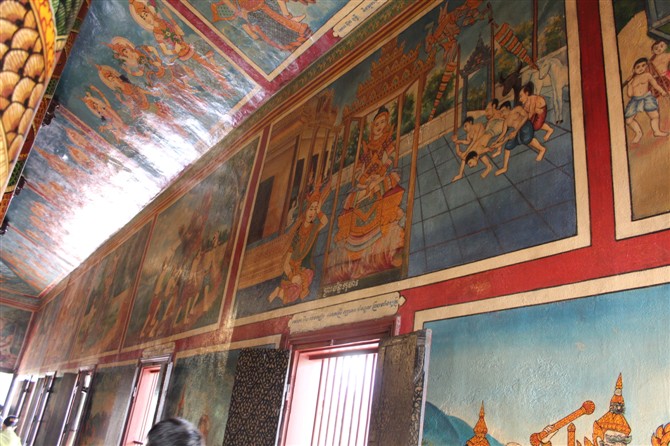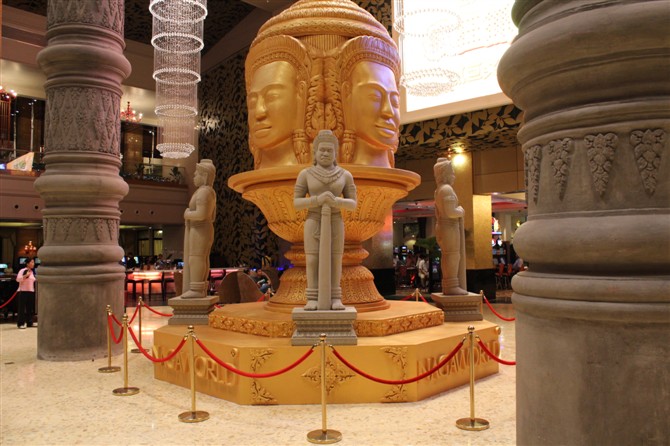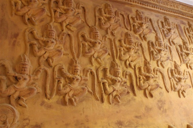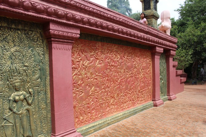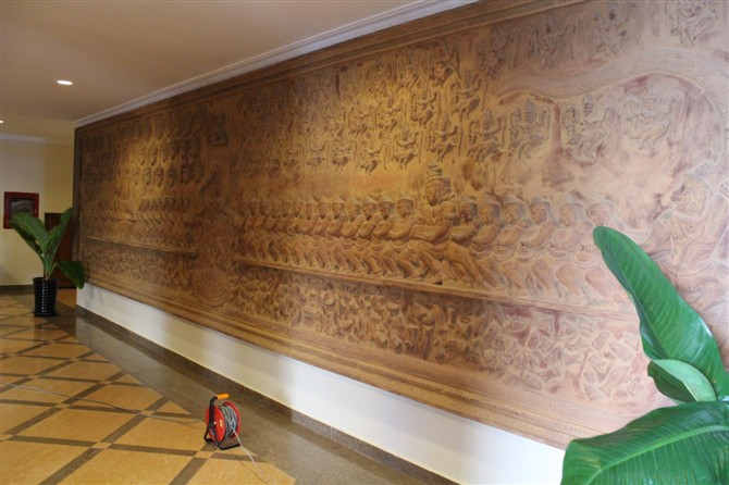 10点多,回到酒店,和早上没去洞里萨湖 自由活动的团友们汇合,一起出发去金边 。在等团友们下来时候,我突然想起酒店大堂里有值得拍照的场所,于是一人拿着相机跑到了酒店大堂。去柬埔寨 之前,特意在网上搜了一下介绍吴哥窟 的资料,看到了探索频道曾经拍过一个专门介绍吴哥窟 的短片,上面讲了一个刻在吴哥窟 的古印度 神话,没想到这个神话我在酒店的大堂居然看到了,真是神奇。
