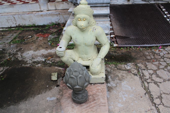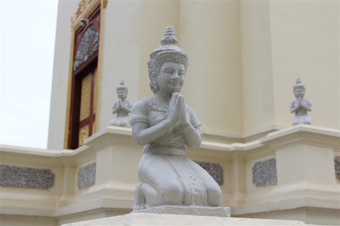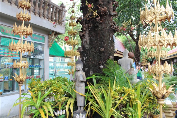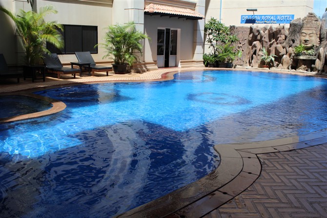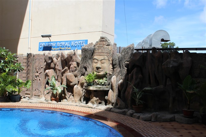 白天看得非常清楚,游泳池边上也有极具柬埔寨 风情的雕塑。
