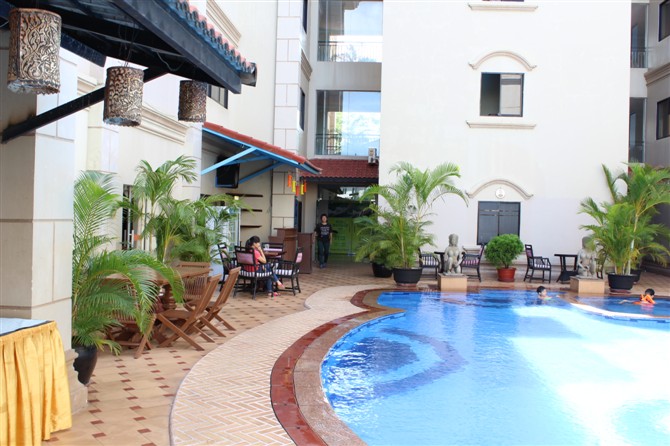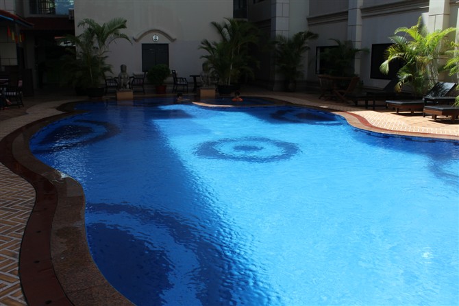 酒店里有一个游泳池,非常遗憾,尽管带了游泳裤,但是第一天晚上的时候由于老婆太累,没有去游泳。后面在金边 和胡志明住的酒店都没有游泳池了,房间也小了很多。