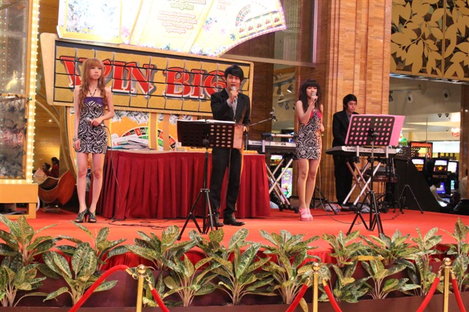 自助餐旁边就是赌场,好像里面中国 人比较多,我们对赌博一点兴趣都没有,就漫无目的的瞎逛,在酒店大堂的另外一端看到有3个年轻人在唱一些流行歌曲,居然还有张柏芝的“星愿”,不过是用外语唱的。