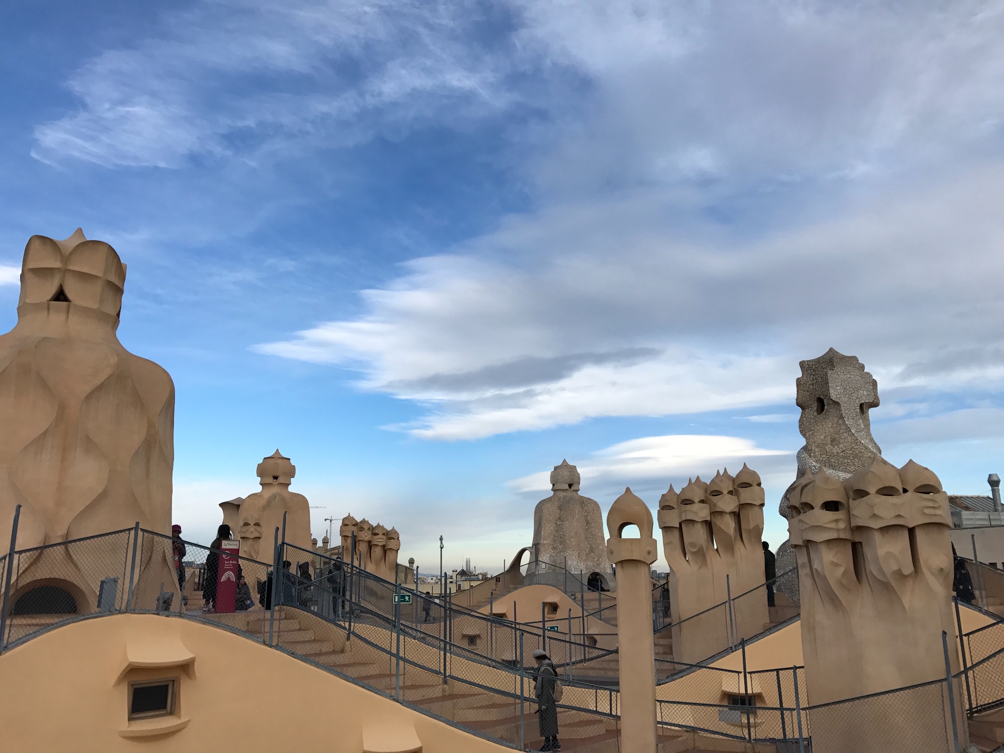 米拉之家,波浪形起伏的外观,奇形怪状的烟囱通道,看似怪诞却又实实在在的独树一帜。除了内部结构,屋顶也非常值得一看,如高迪所认为的,“直线属于人类,而曲线归于上帝”。