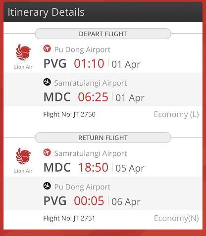 上海浦东直飞美娜多的航班,每周三、五、日有一班飞机,印尼狮子航空,代号:JT2750。