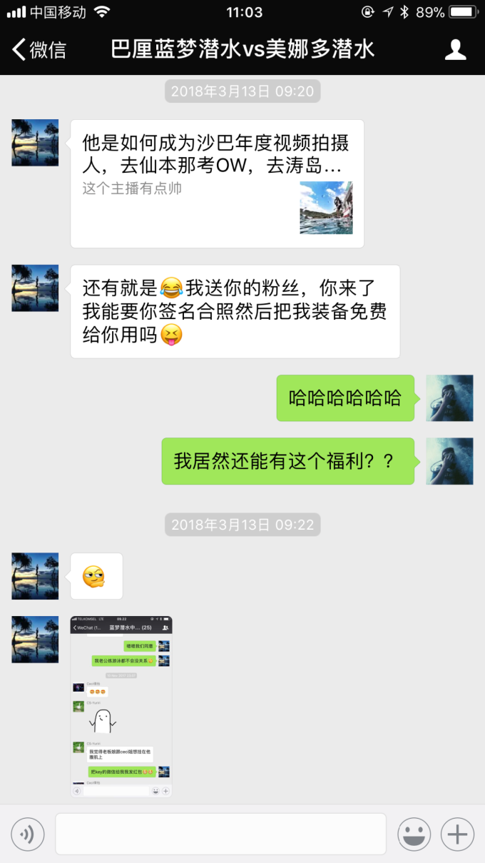 然后让我之前的潜水教练给我推了一个,好家伙这个更厉害了,朋友圈一张照片都没有,这下心里更没底了,让对方发了份价目表过来了解一下,再放一放。