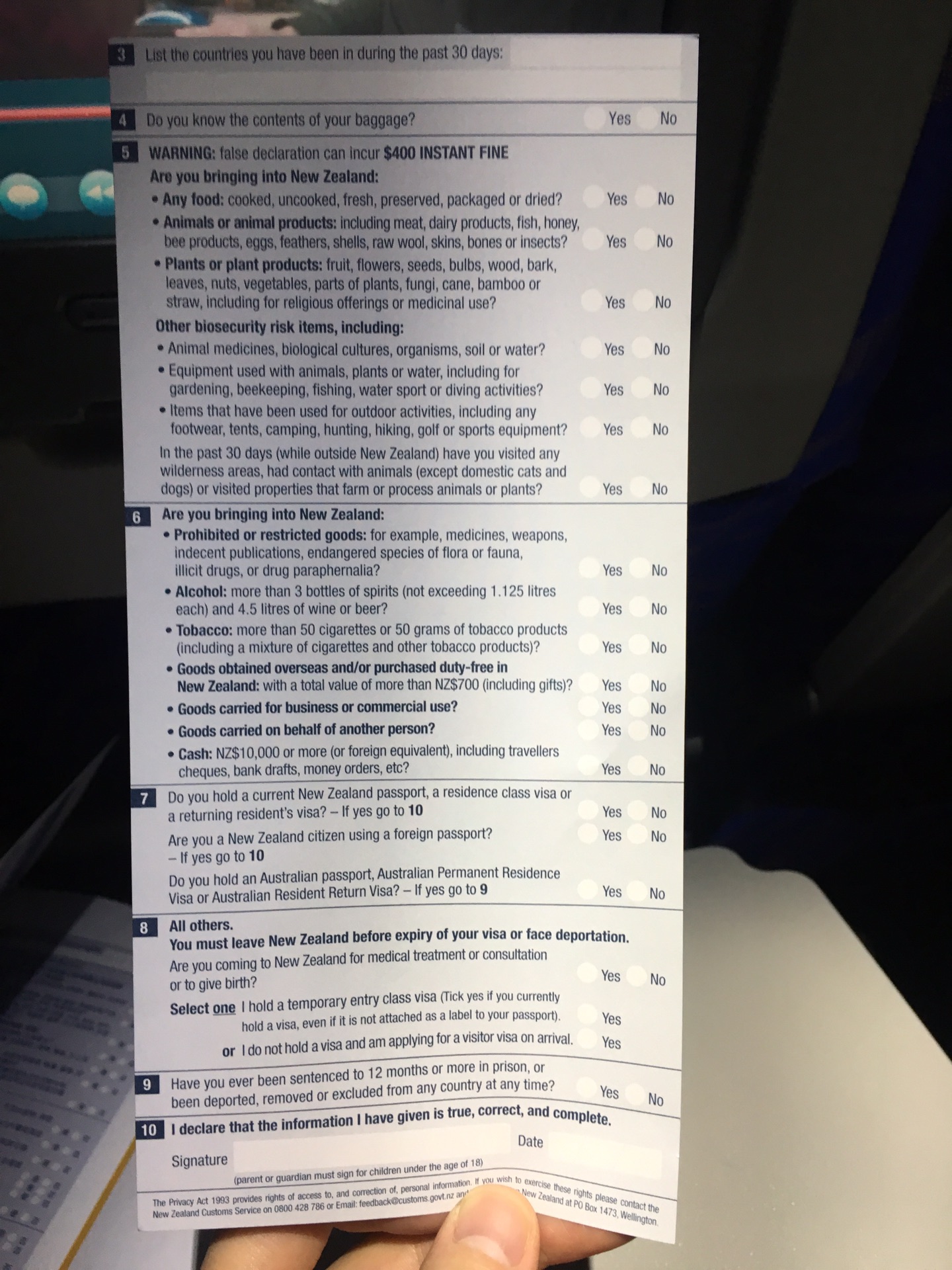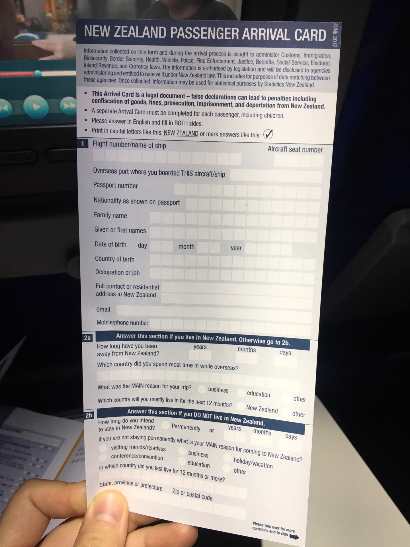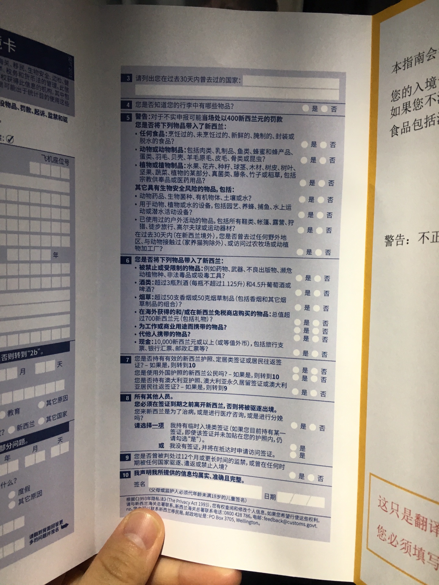 空姐发放的新西兰入境卡➕中文填写指南