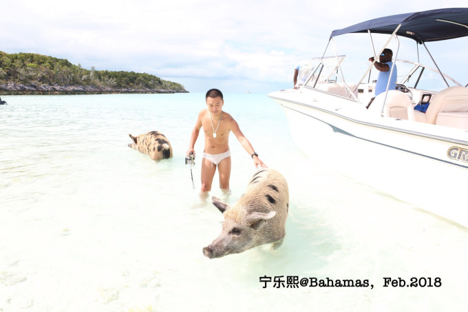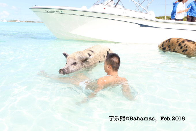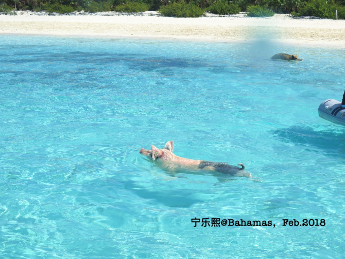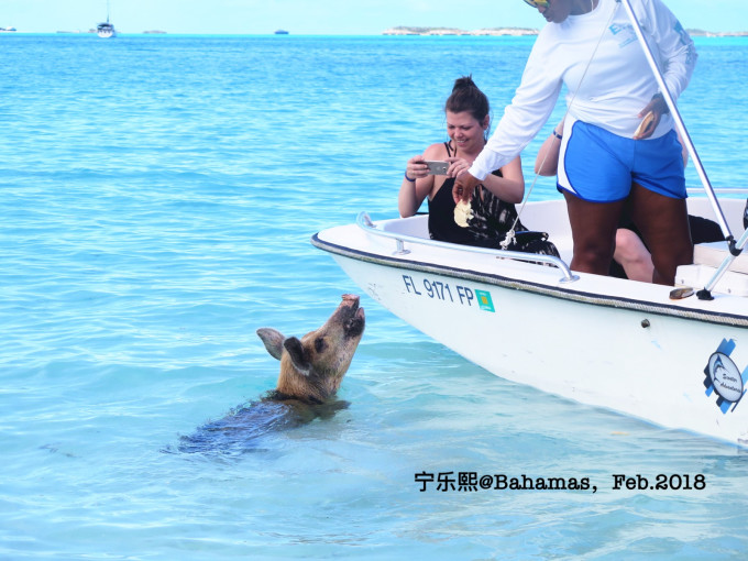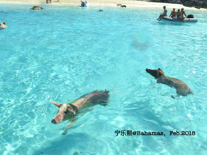下一站就是著名的猪岛了。这些猪是当年途径此处的水手留下的,原本是打算作为食物的,但后来这些猪缺留在了这里繁衍。它们喜欢结伴游泳,也不怕人,上岛的很多游客也会喂它们。这些终年生活在这阳光海滩上的猪被誉为世界上最幸福的猪。