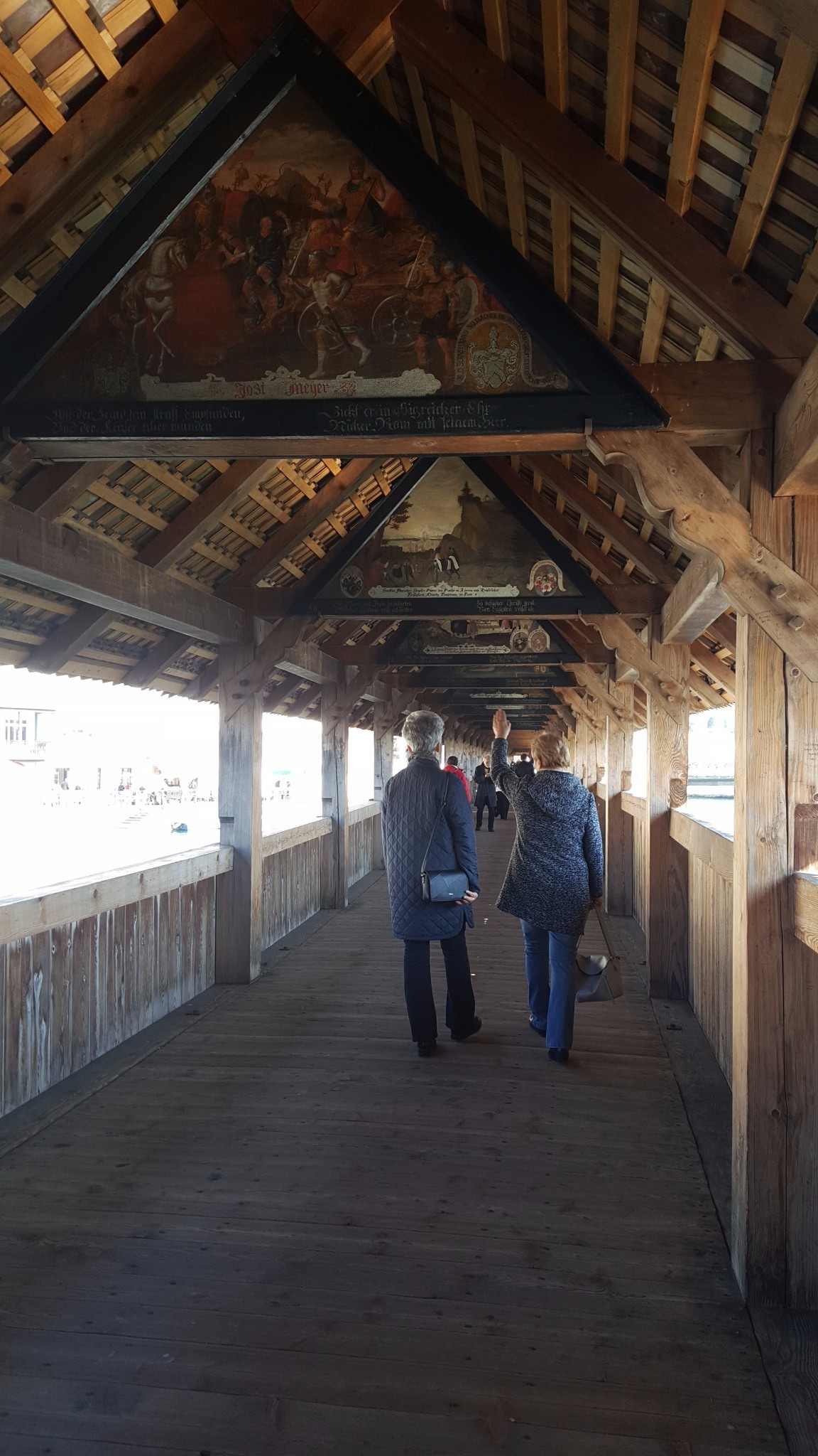 这座古老的木桥始建于1933年,在桥的横梁上面画着120幅宗教历史油画,其中还包括当年黑死病施虐欧洲时的油画。