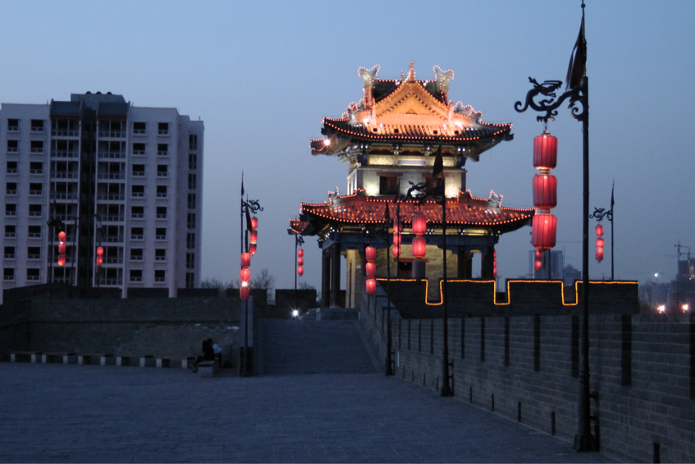 夕阳的余晖渐渐陨落,花灯初上的光影投在古老的西安 城墙上,角楼的红灯笼一晃一晃,恍惚间戎马一身的守城侍卫威严肃立;瓮城上霓虹璀璨,又好似将军坐怀不乱,等待着边陲传来的紧急军情。突然,两个醒目的大字“西安 ”撞进了我的视野,我这才意识到这是在2012年的西安 早春。此时,夜幕已潸然落下,城墙上已空荡寂静,偶尔有人在长跑锻炼,我悠闲地骑着车、大声的唱着歌,任自由与激情在古城上空盘旋、飞扬。