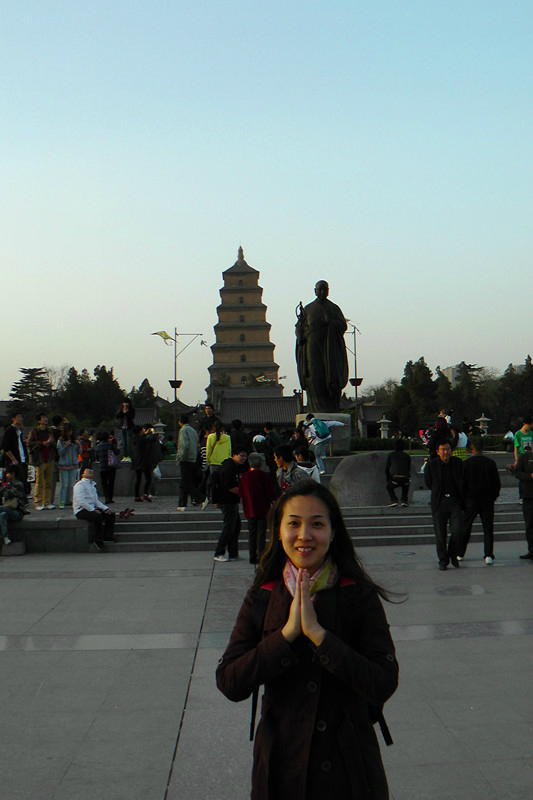 夕阳下,远望大雁塔,站在玄奘高僧的塑像前,仿佛正在聆听他传经讲道,周围的喧嚣即刻化为内心的平静,他坚定的眼神,竖立的佛掌,微微前倾的身躯,把我带回到了那个久远的时代,也是在这里,在大雁塔下。忽然,我向他发问“为何你心中的信念是那样的坚定”,他浅浅的一笑没有回答,但似乎回答了一切。在佛像前久久的逗留,不愿离去,像是有种魔力,深深的吸引着我,直到华灯初上。我也问自己,“我是否也能像玄奘法师一样,坚定心中的信念”,但是我的信念是什么,生活的打磨已经早已让我将信念抛之脑后,一天一天,一年一年,不咸不淡,不紧不慢,没了信念,我还剩下了什么。