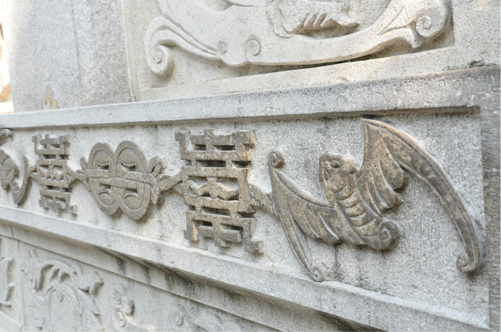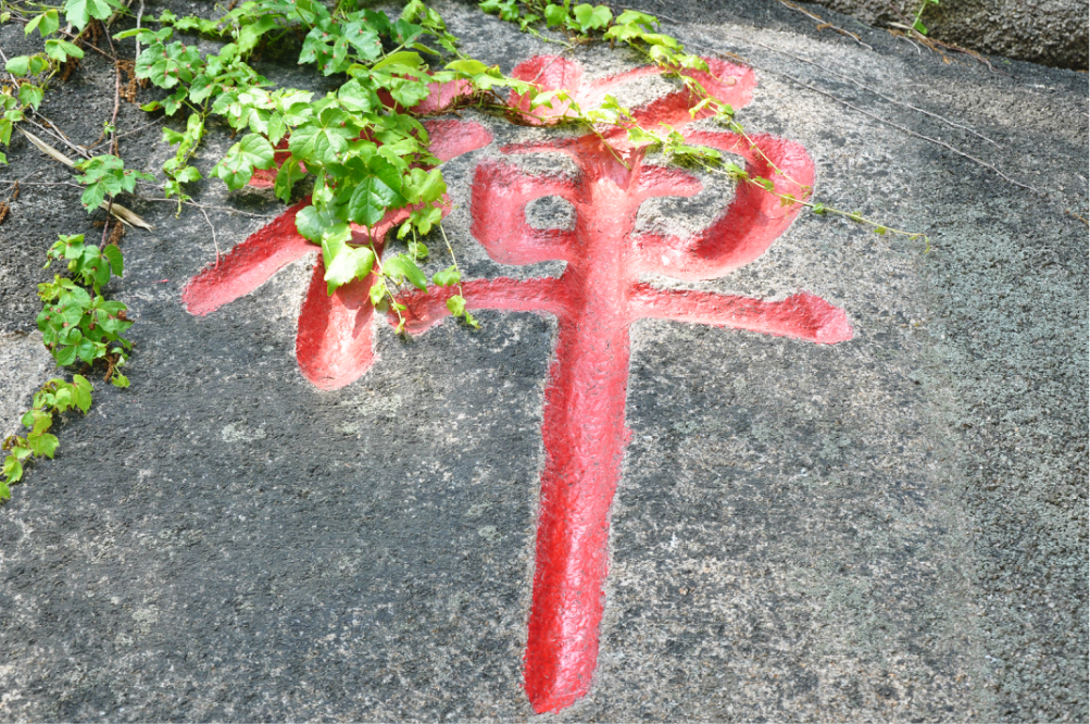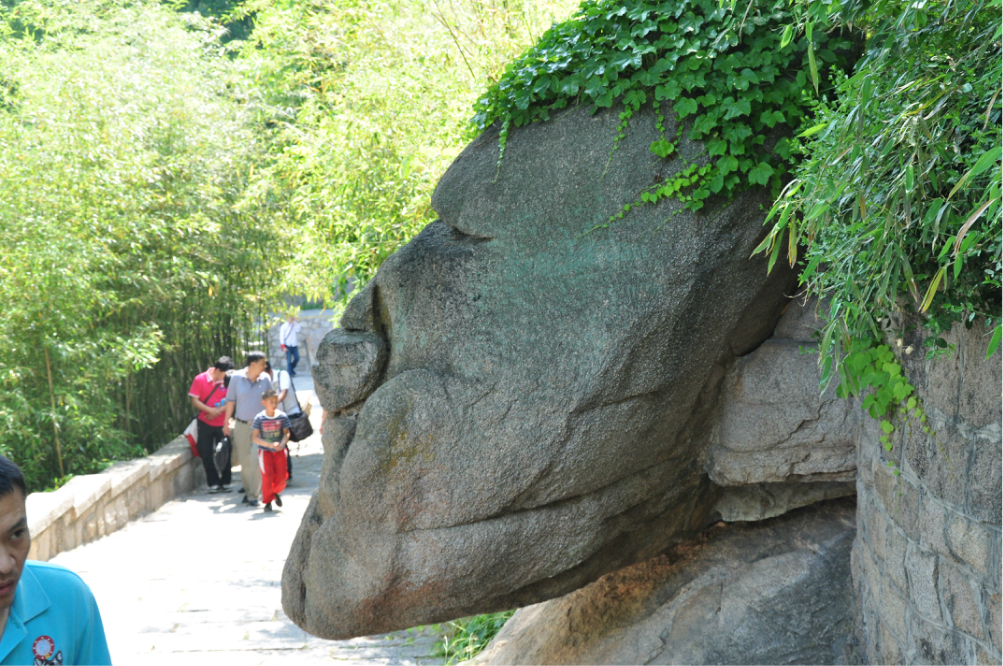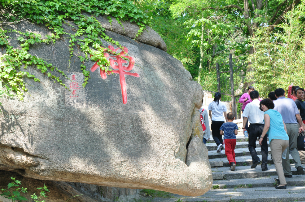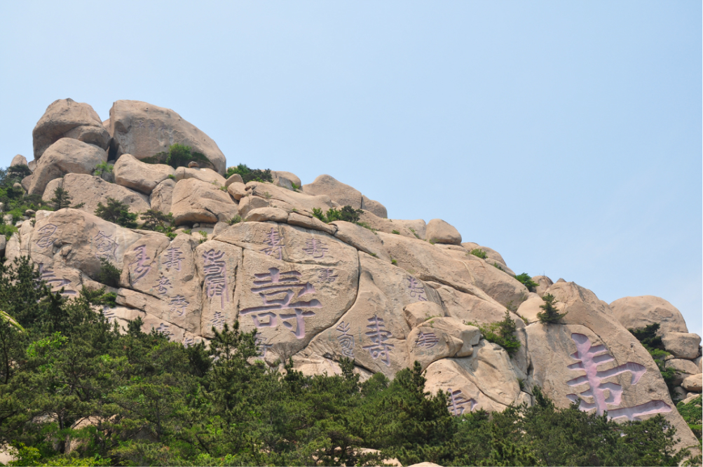 缆车缓缓向上,郁郁葱葱的绿就踩在脚下,有种飞仙之感。突然右侧一块巨石之下“仙桃 ”二字映入眼帘。再仔细端详着巨石,的确宛若一枚巨大的仙桃 。据说,这桃子能在这里,还得感谢孙大圣呢。当然他老人家大闹王母娘娘的蟠桃会,在桃园 里偷吃仙桃 时,咬一口,扔一个地祸害,其中一个刚好就落到了这里,变成了石头。那桃子下面的缺口就是孙大圣的咬过的印迹。既然有桃子,那一定离不开“长寿 ”,果不其然,随后便看到不远处的石壁上镌刻了不同字体的“寿”字百余个,其中最大的一个被称为“天下第一寿”。
