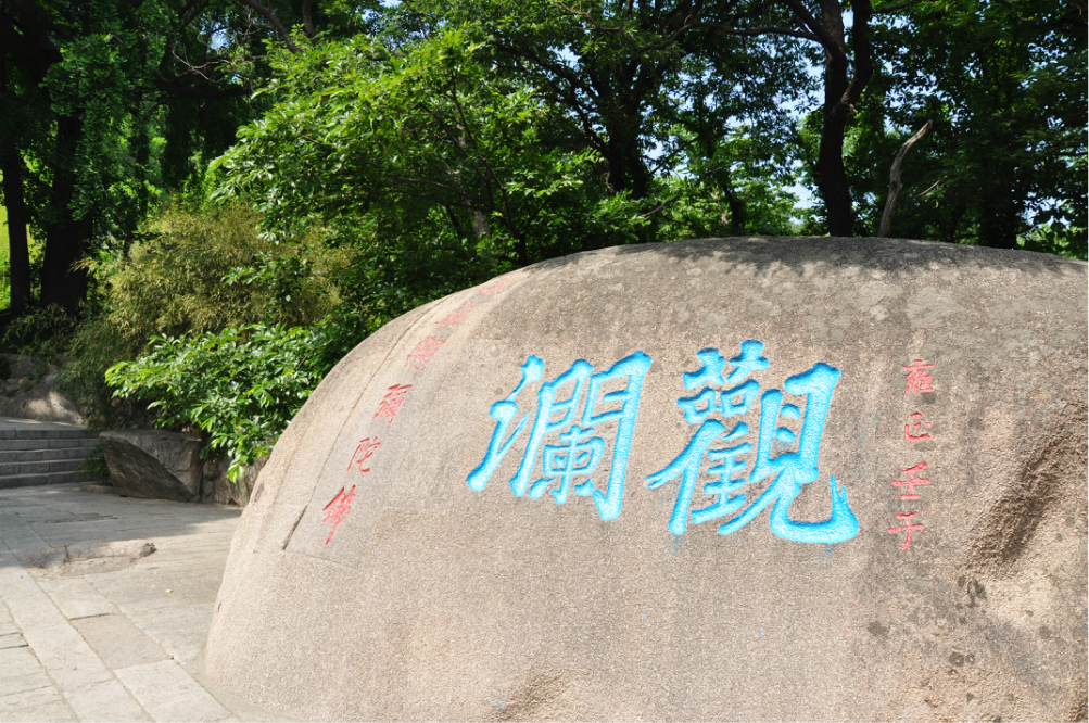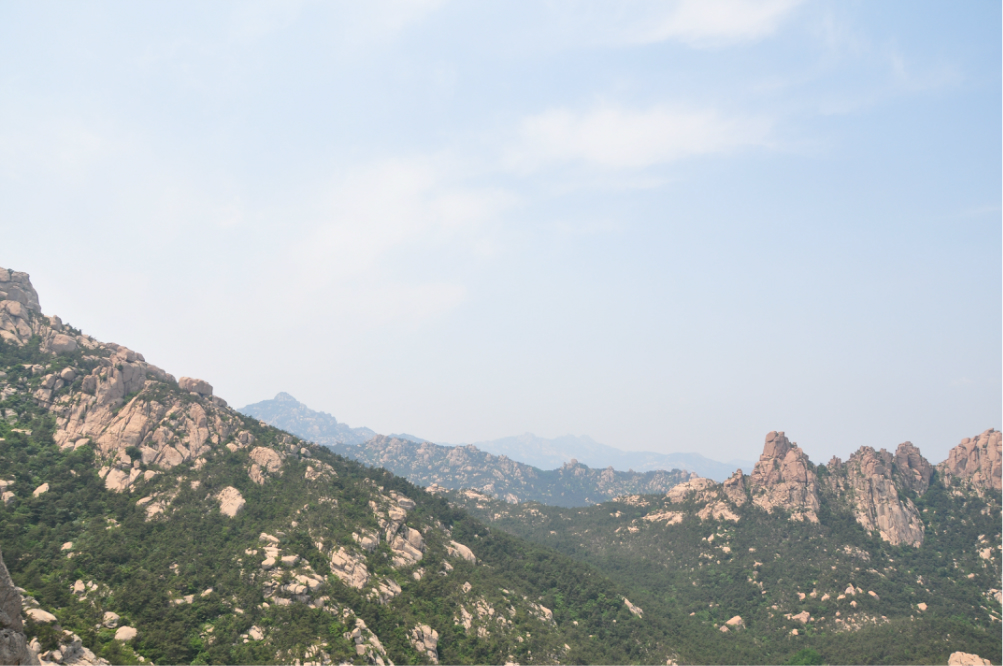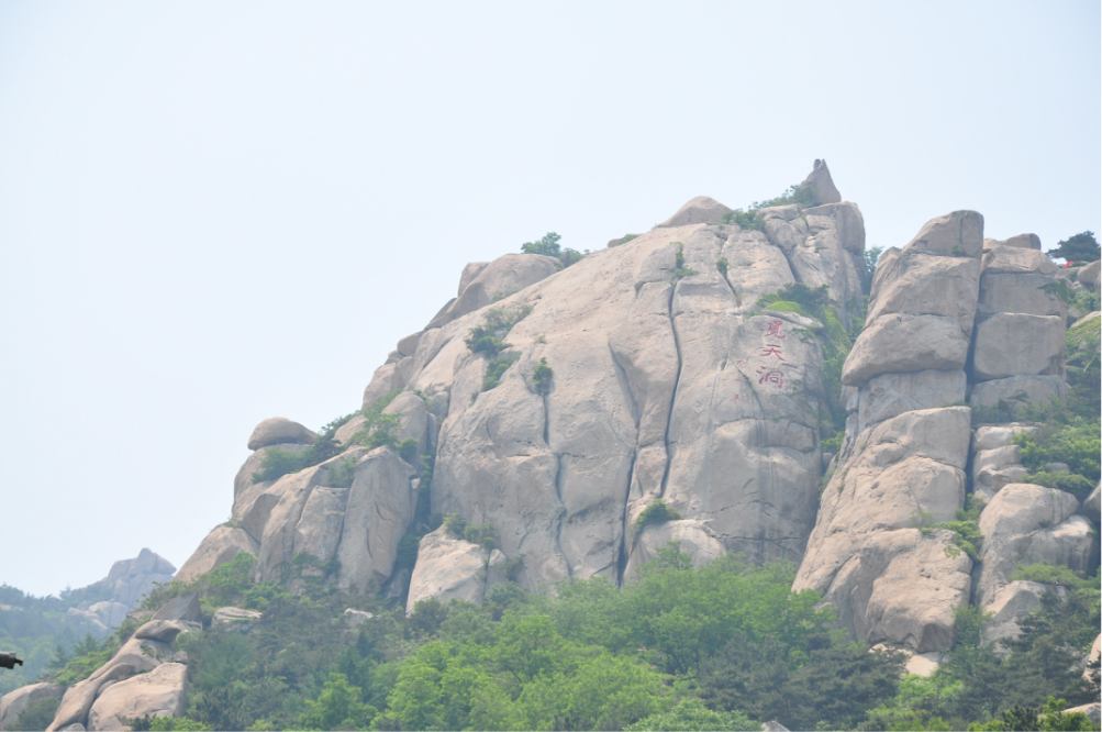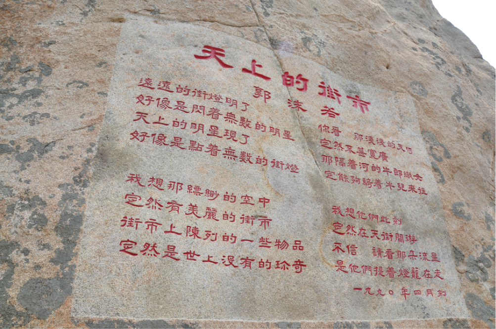 不一会儿,一块巨大的石壁立在眼前,郭沫若的《天上的街市》被刻在这里,倒也颇有新意。我在想,如果是晚上登山至此,面对仰口湾方向的阑珊灯火,这《天上街市》的味道会更浓郁吧。行至此处,也就到了仰口段崂山 景区的最高点了。环视四周,怪石林 立的山峰,连绵起伏,我只能再次苍白无力地感慨大自然鬼斧神工的奇绝。而当时的那种震撼,是语言无法企及的。