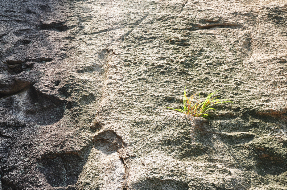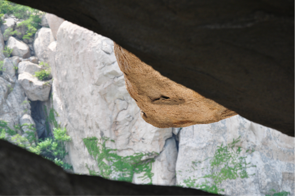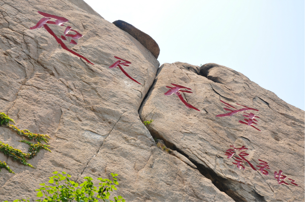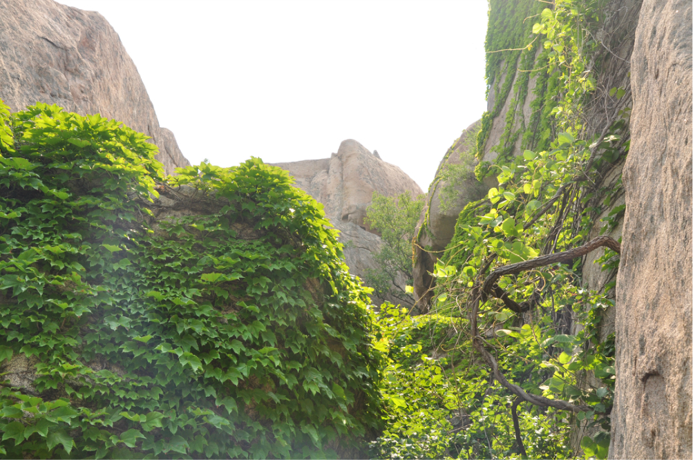 出得洞来,突然有种“阳光灿烂,人生美好某虚度”的感慨。突然,洞上方花岗岩壁上的一小簇野草让我着实感慨不已。这弱不禁风的小草居然可以扎根石壁,功力非同一般啊。随后的景色也开始进入佳境,不过更让人欣喜的是,每一处绝美处,都有一些名人的题字、题词,比如 ,觅天洞外石壁上所刻“山高无风暑自消,洞幽不雨草常湿”就出自我国著名美术理论家邵大箴先生。