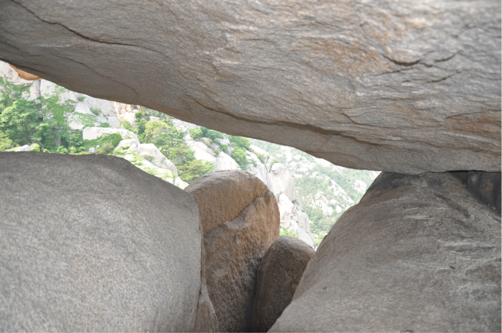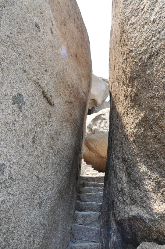 下了缆车,我们不紧不慢地往山顶爬,沿途上不少贩卖水果工艺品的小摊。如果没带够食物和水,一定不用发愁。不一会儿,觅天洞就到了。由于不是旅游旺季,是有三五个游人到此游览。这倒让我有机会细细观察。原来在两个山缝隙间几块巨石叠压,加上人工修建的铁梯和护栏,俨然一个小石楼。“觅天洞”三字是刘开渠先生的手笔。进得洞中,才发现这里没有回头路可以走,我们只能依次攀爬。到了中部,伸手不见五指,手电自然就派上了用场。由于洞中,终年不见阳光,幽暗阴湿,不少石壁都是湿漉漉的。